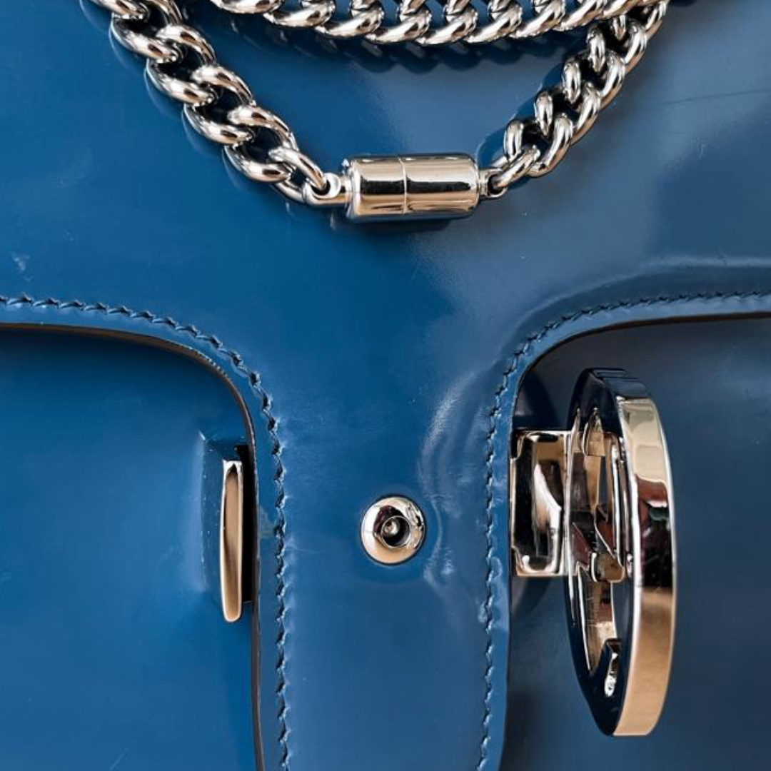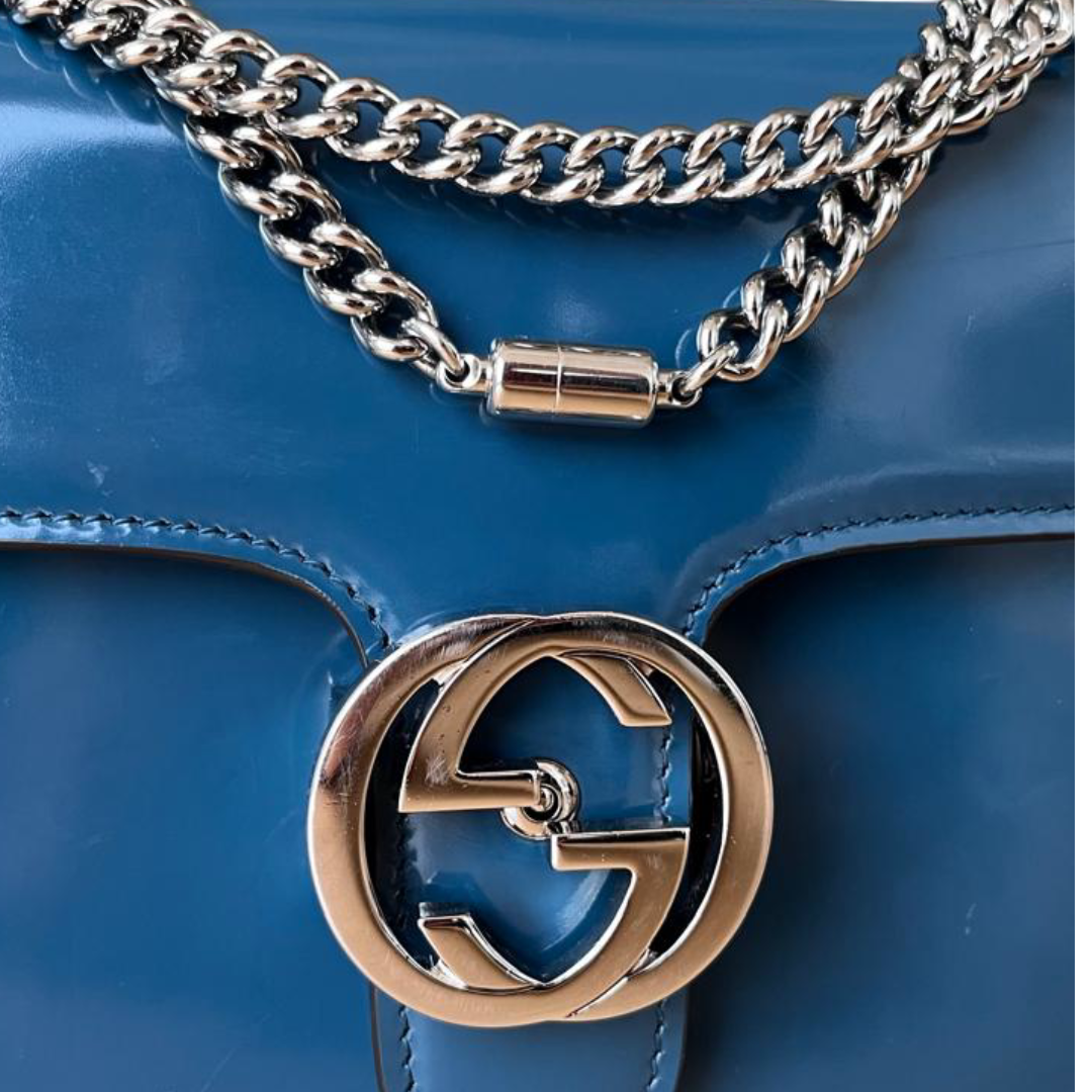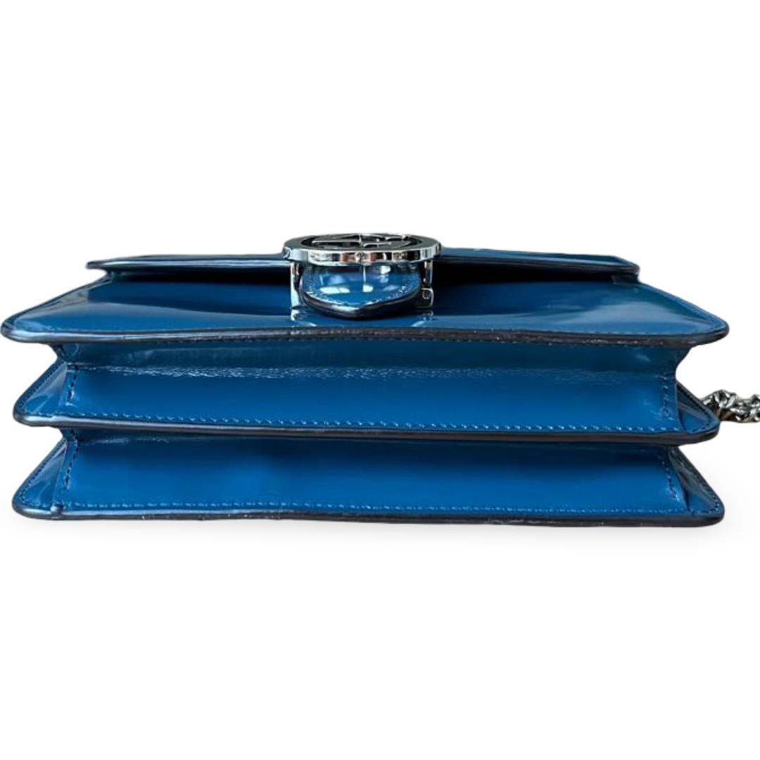 This Gucci Small Shoulder Bag is crafted from glossy blue patent leather with a polished finish. Featuring a flap with signature GG flip-lock closure, it combines elegance with practicality. The silver-tone chain-link strap allows versatile shoulder or crossbody wear, while the interior slip pocket keeps essentials organized.