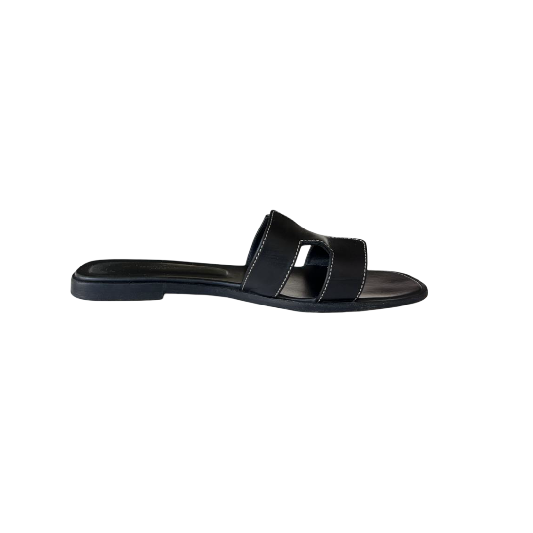 Iconic Hermès Oran sandals crafted in luxurious black calfskin leather with signature contrasting white topstitching. Sleek, minimalist, and effortlessly chic, these open-toe slides are a wardrobe staple for elevated casual and summer looks.
