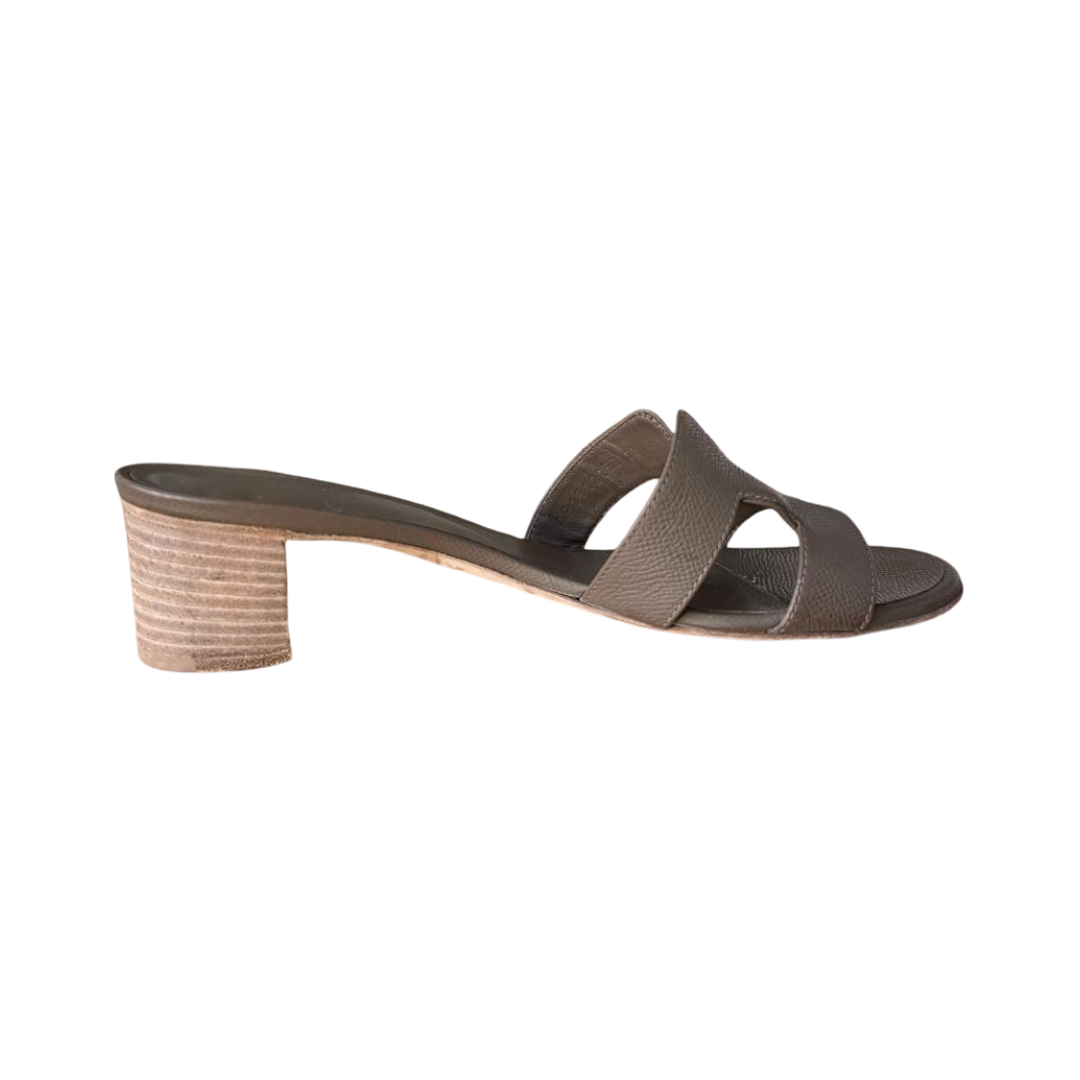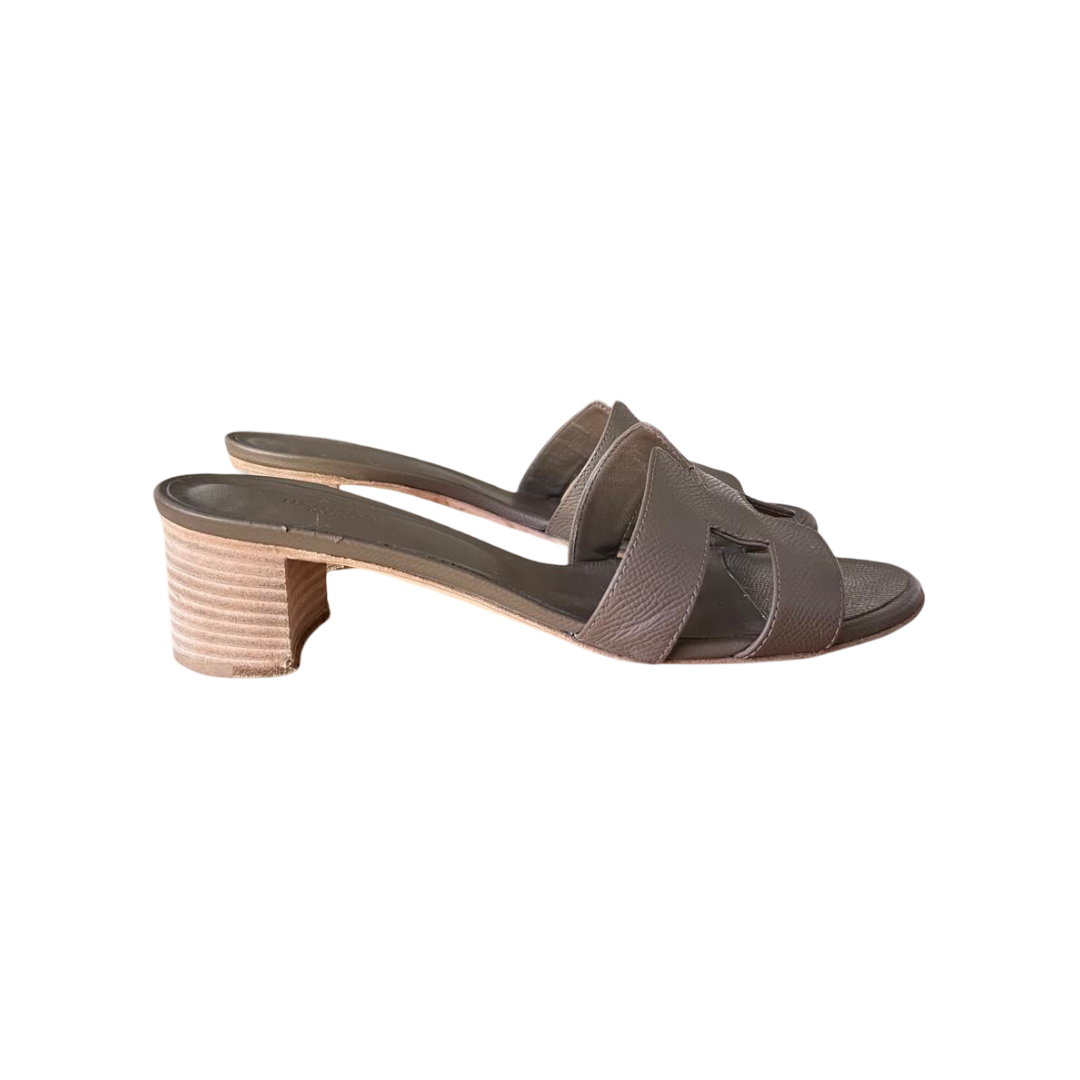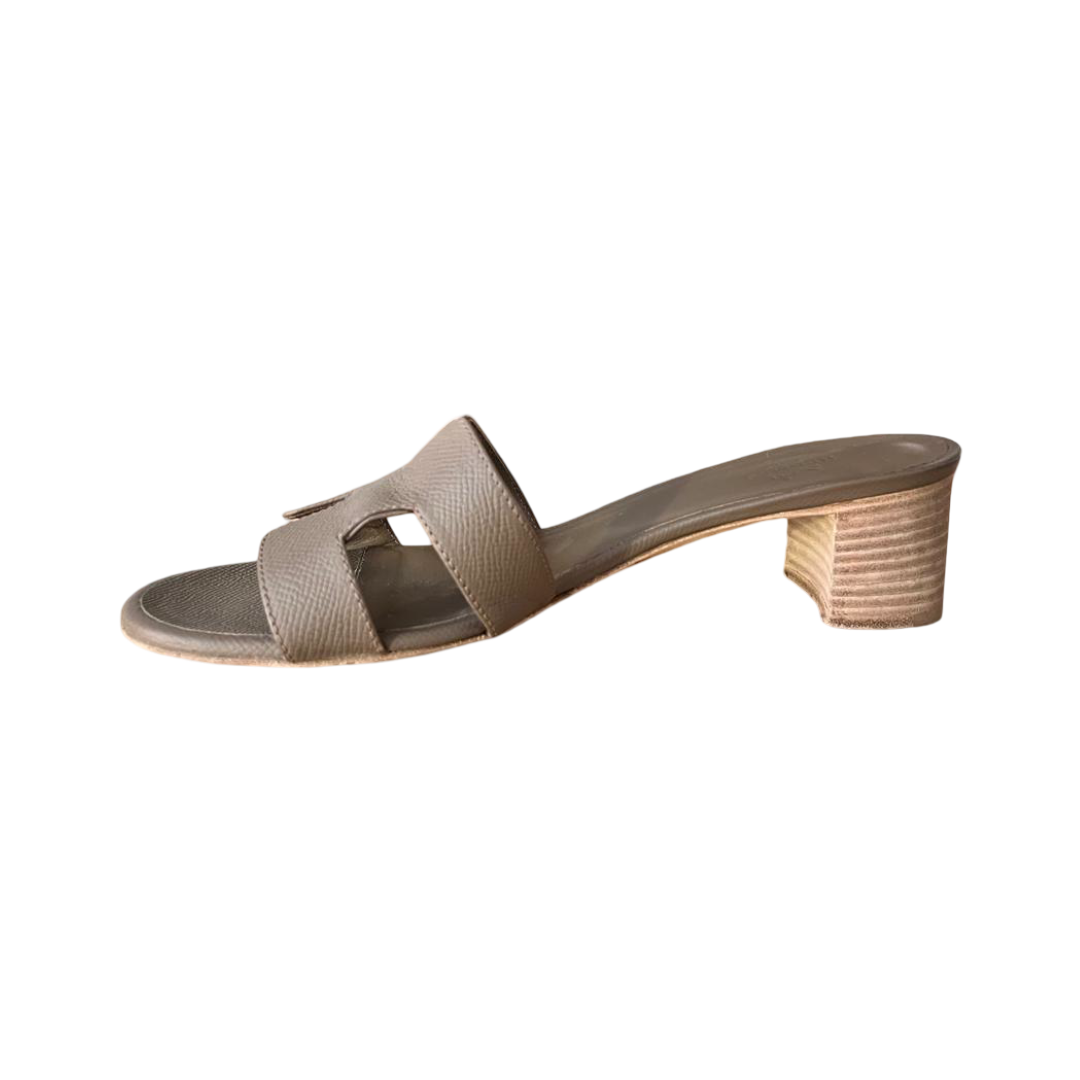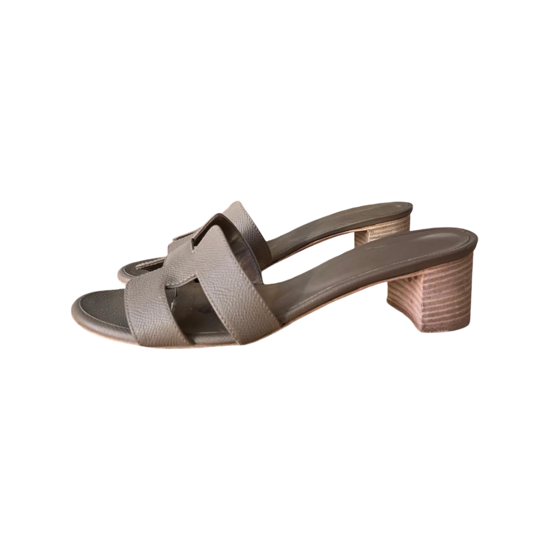 Elegant Hermès Oasis sandals crafted in luxurious Etoupe Epsom calfskin leather, featuring a classic slip-on silhouette with a refined 5 cm block heel. Minimalist and sophisticated, these sandals are perfect for elevated everyday wear or smart-casual occasions.