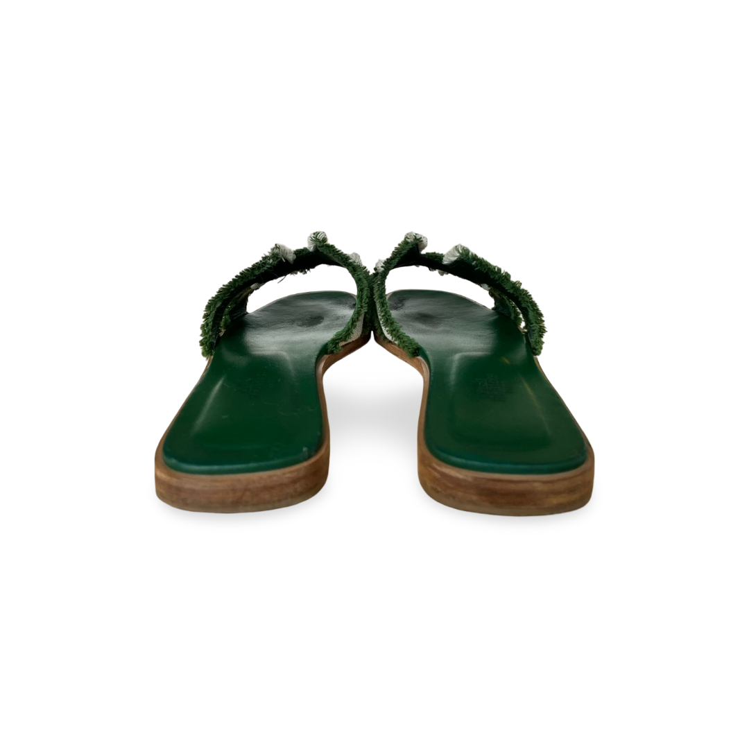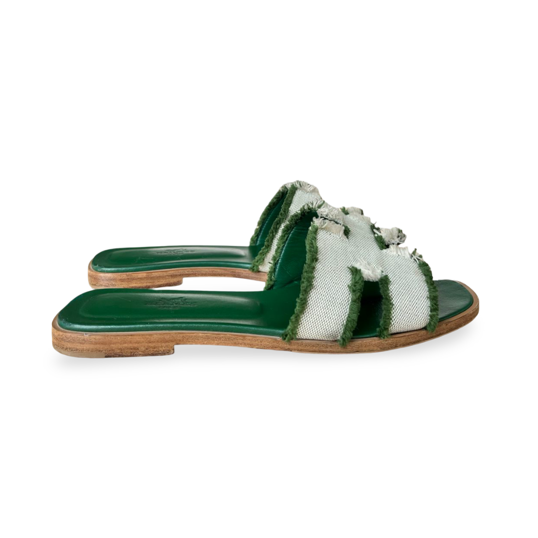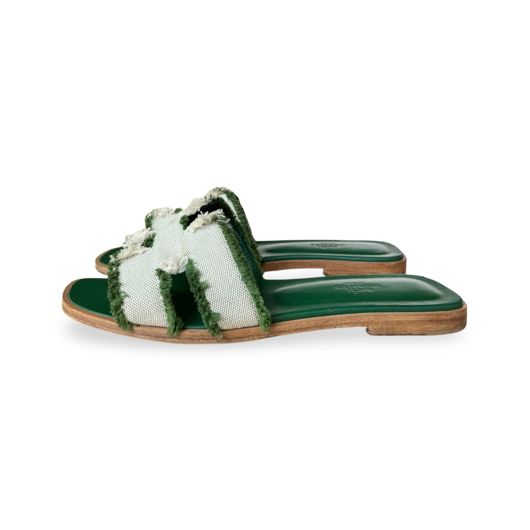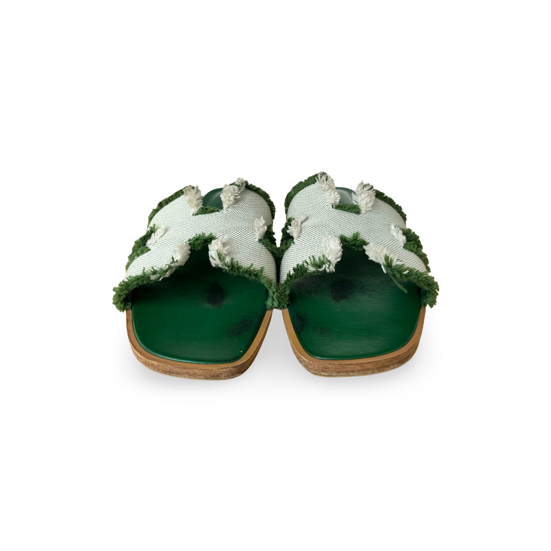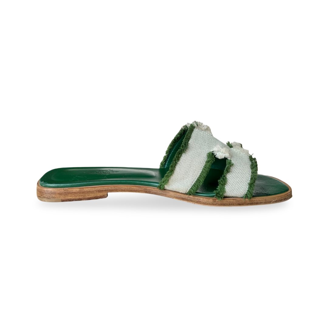 These stylish Hermès Oran Sandals feature a unique fringed linen canvas upper in a chic combination of green and beige, offering a fresh, textural twist on the iconic H-cut silhouette. Casual yet refined, this pair perfectly blends Hermès craftsmanship with a relaxed, warm-weather aesthetic.
