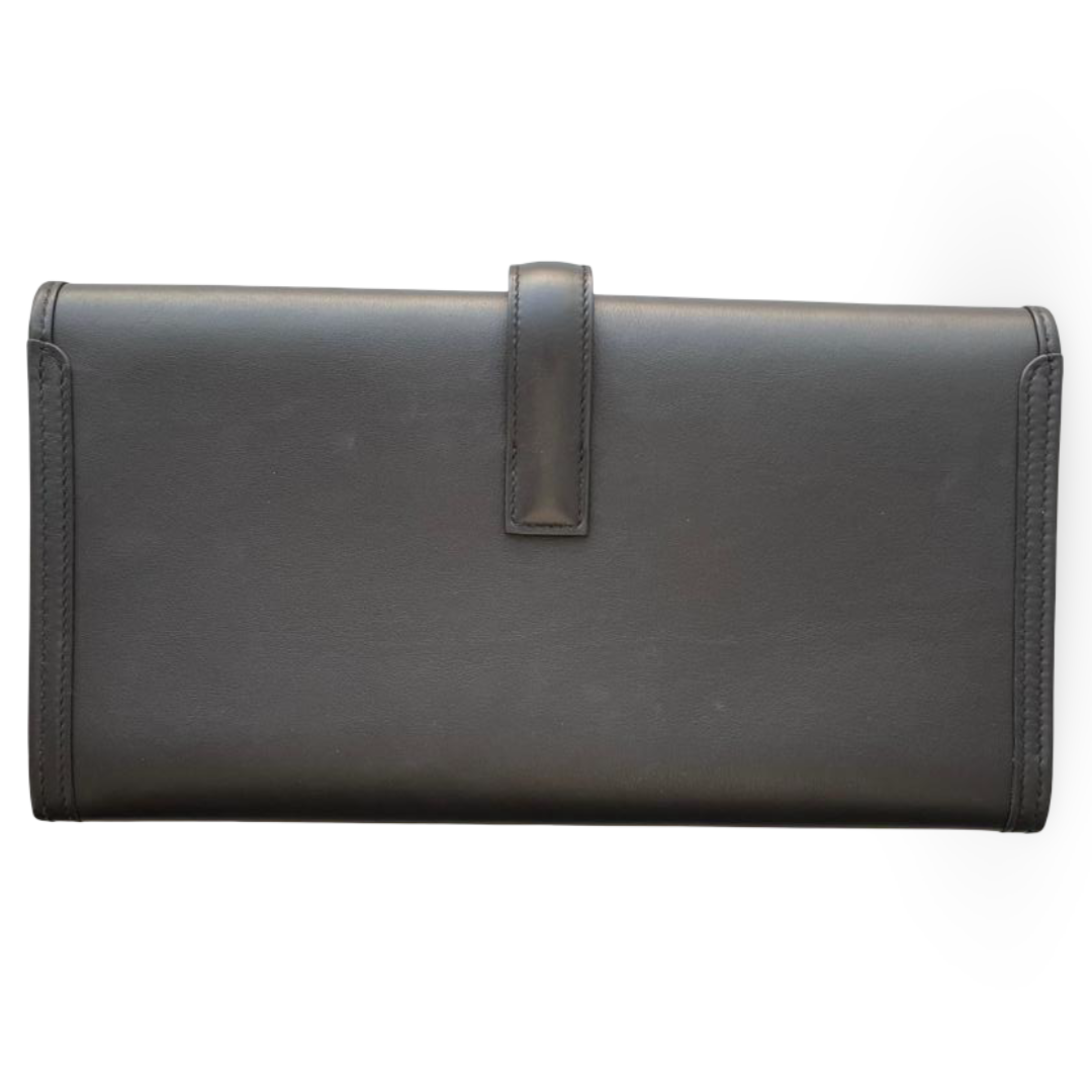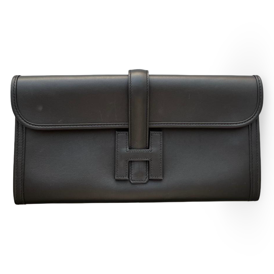 The Hermès Pochette Jige Élan 29 is a timeless and elegant clutch, crafted from supple Veau Swift leather in classic Noir (black). Defined by its sleek silhouette and the iconic ‘H’ tab closure, this clutch embodies understated sophistication, perfect for both day and evening occasions.