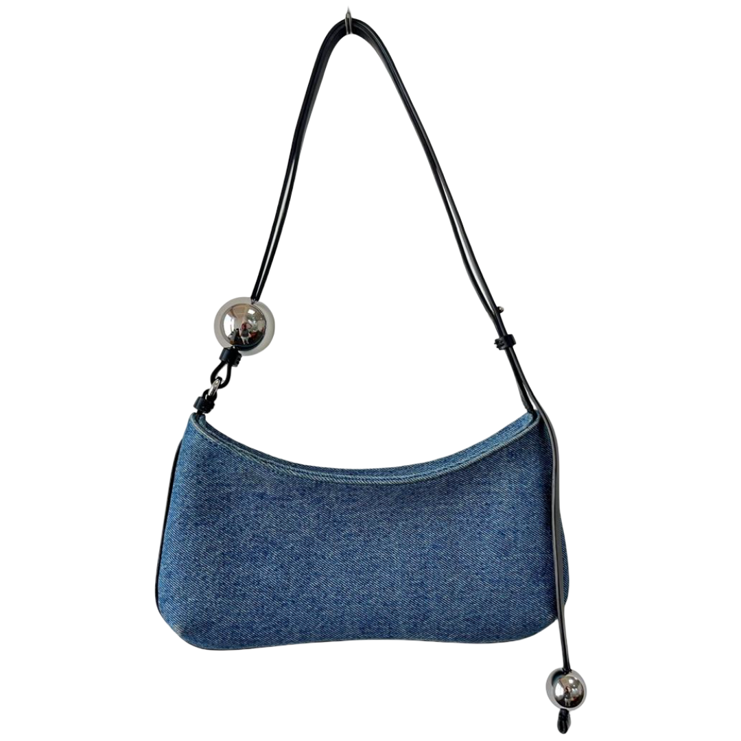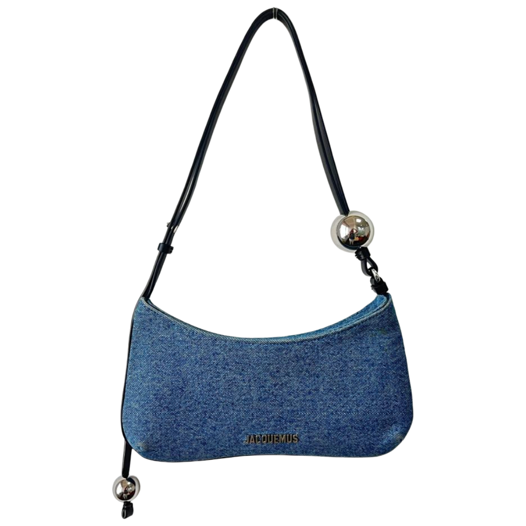 This Jacquemus Le Bisou Perle Shoulder Bag is crafted from blue denim with a smooth goatskin trim and features an adjustable buckled leather strap accented with a large bead detail. Finished with gold-tone logo hardware, it’s a compact yet statement piece perfect for elevating casual looks.