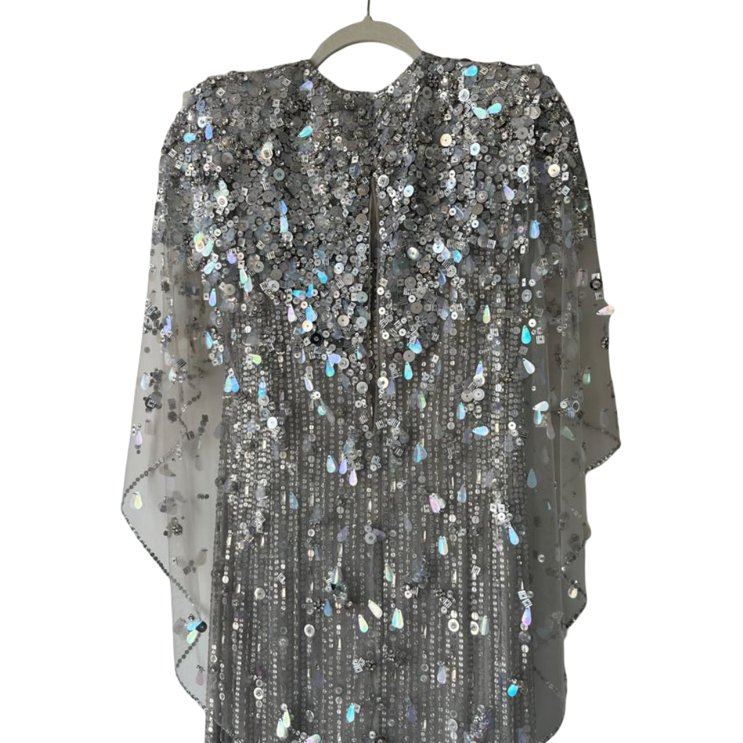 This Jenny Packham Nettie Gown is an exquisite example of the designer’s signature elegance and crafted from luxurious gray and silver sequined tulle and features a dramatic cape-effect overlay. Perfect for formal events, red carpet appearances, or evening galas, this gown combines glamour with timeless femininity.