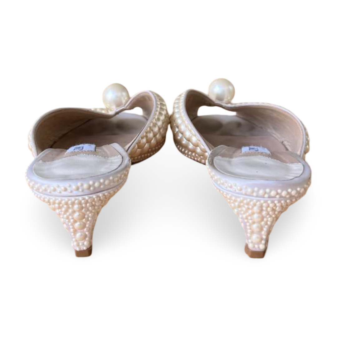- Condition: These mules are in excellent pre-loved condition. The satin is smooth and clean, faux pearls are intact, and the leather soles show minimal signs of wear.