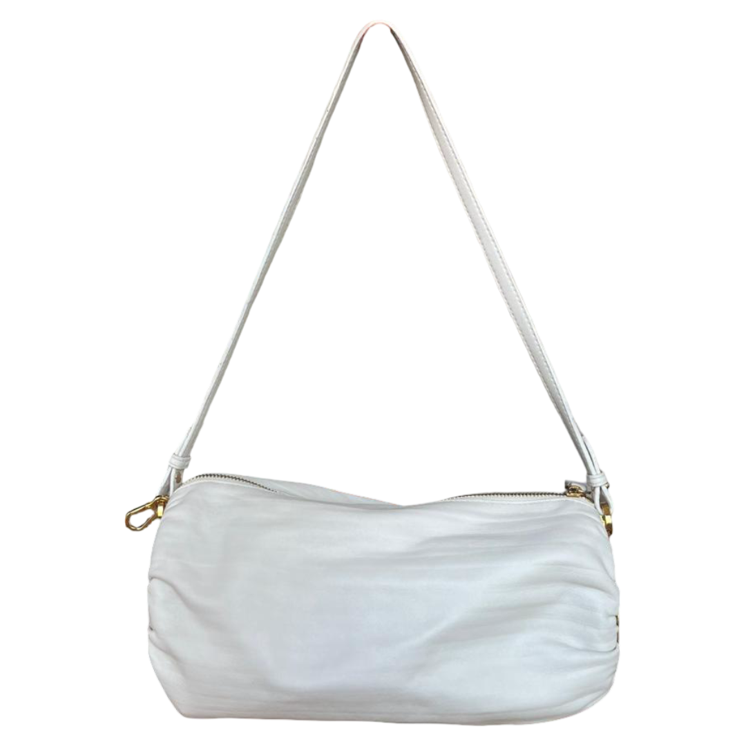 This Loewe Bracelet Pouch is crafted from soft pleated nappa leather in an elegant soft white tone. It features a signature gold-tone brass panel, a secure top zip closure, and a detachable shoulder strap for versatile wear. The unlined interior reflects Loewe’s minimalist aesthetic and impeccable craftsmanship.