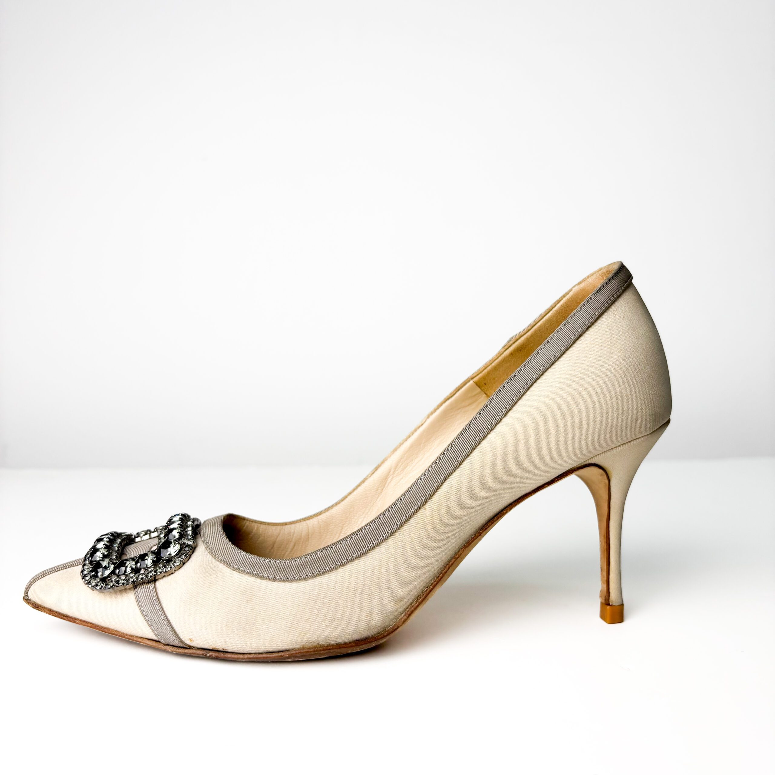 Manolo Blahnik Beige with Grey Trim & Crystal Buckle Hangisi Satin Pumps — Size 38