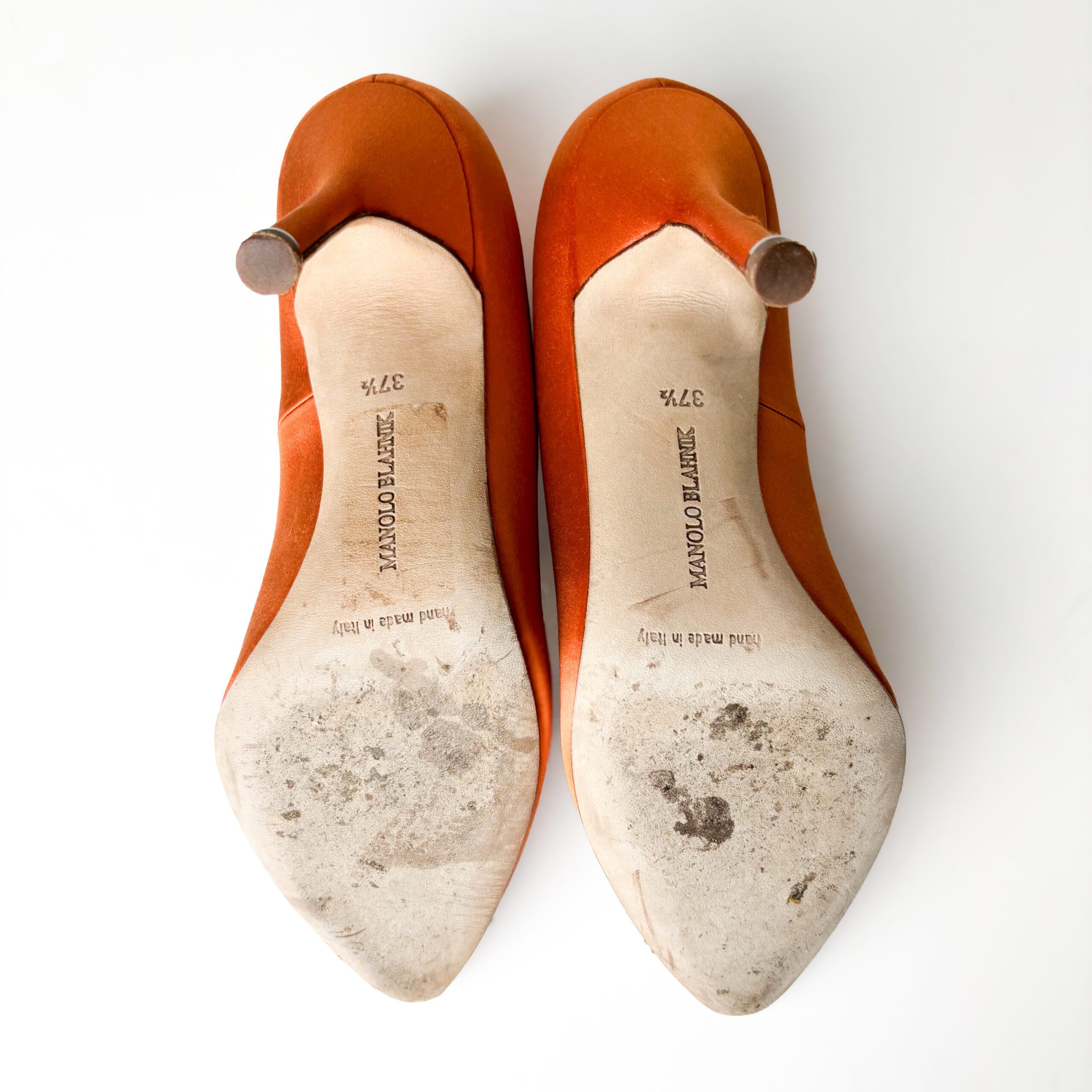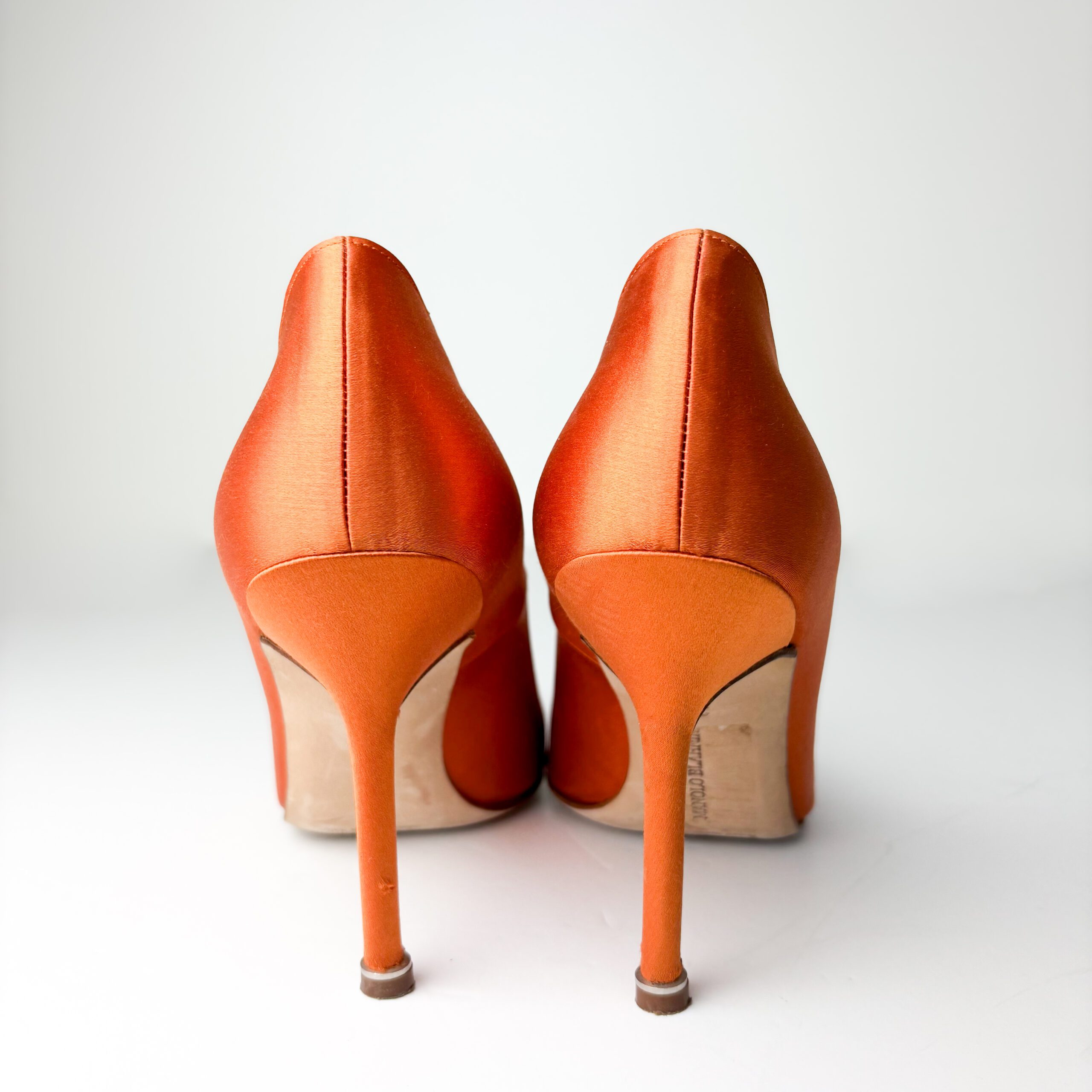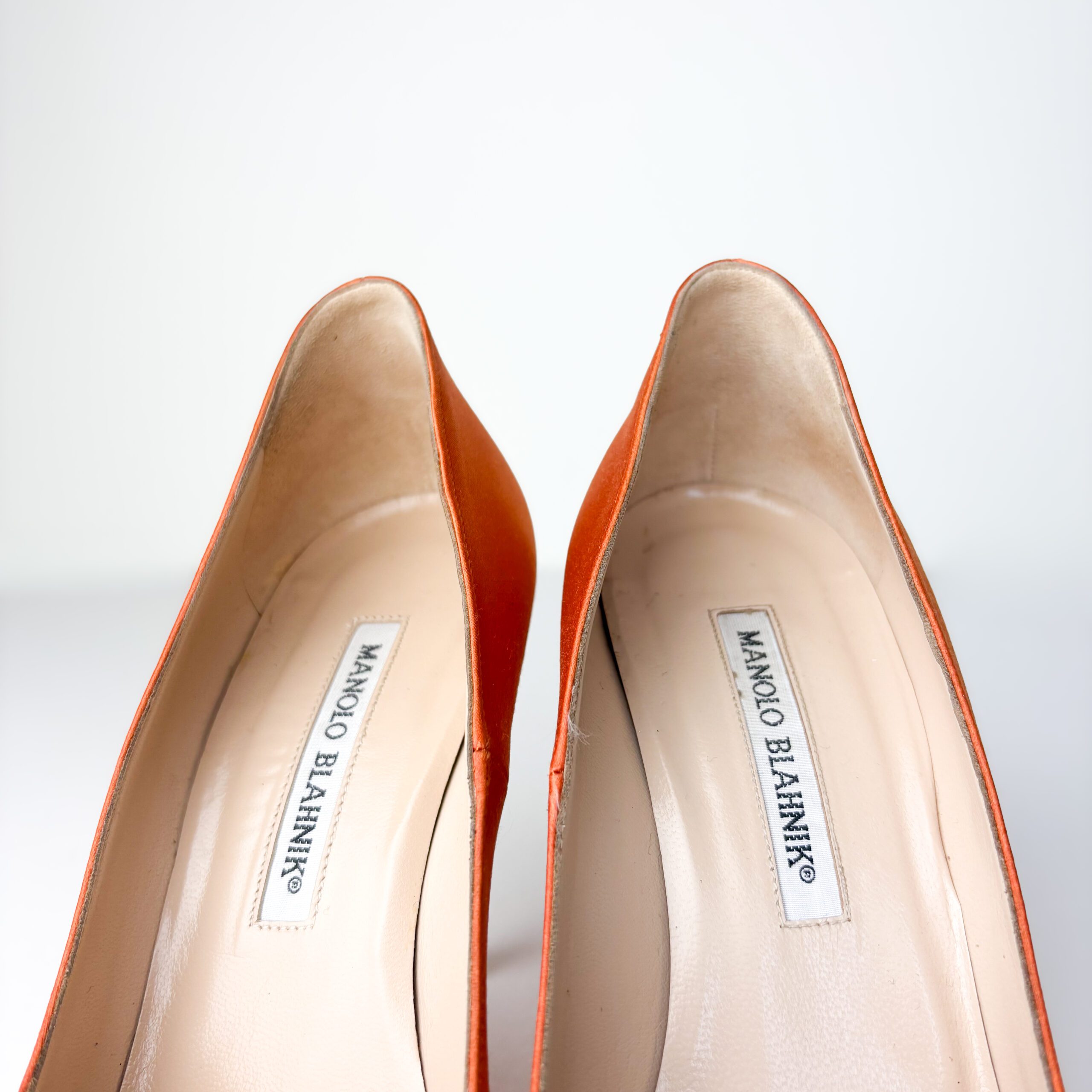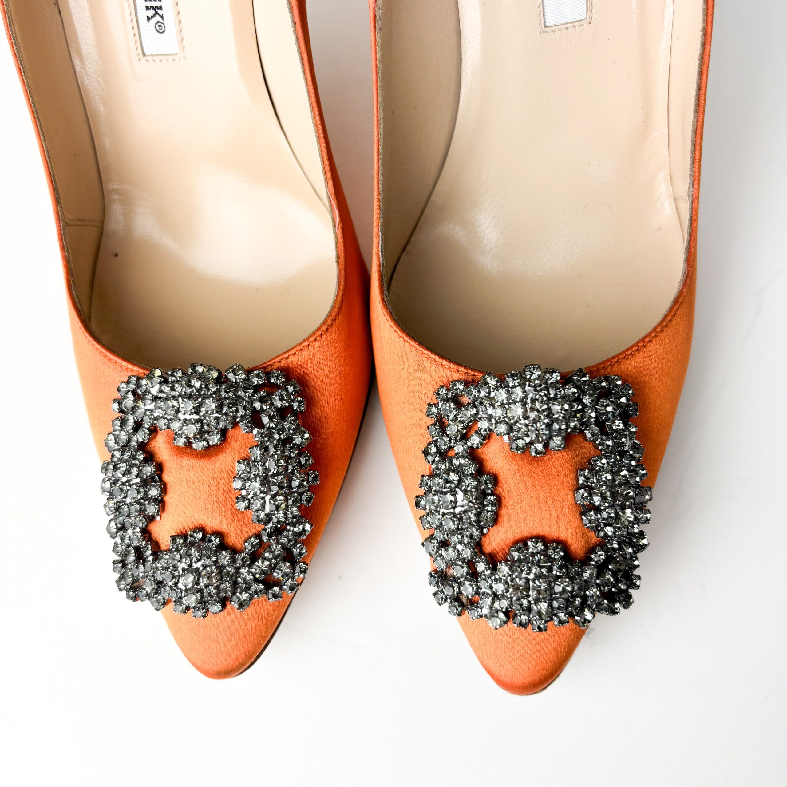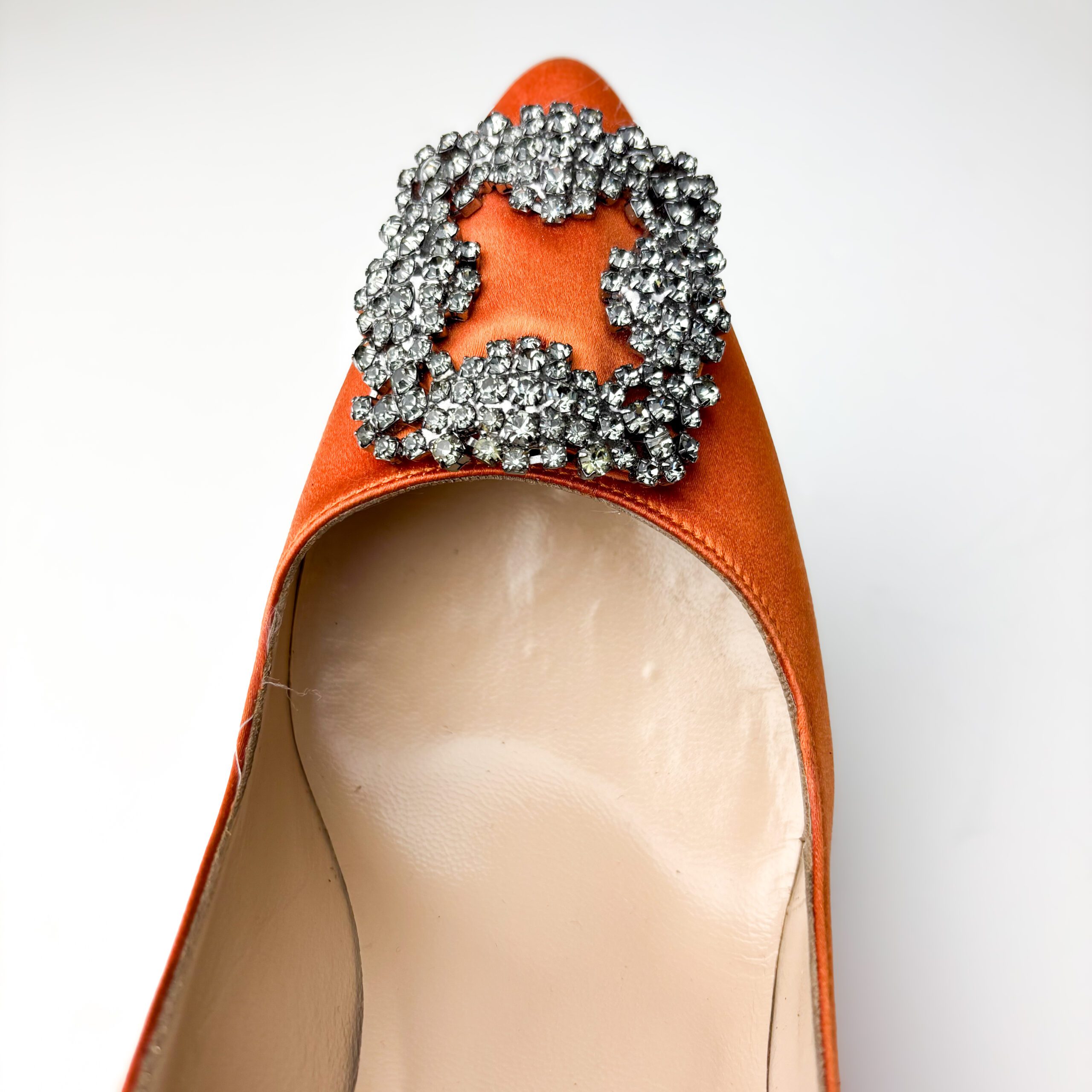 Iconic Manolo Blahnik Hangisi pumps crafted in vibrant orange silk satin, featuring the signature pointed toe and dazzling crystal-embellished buckle. A timeless, elegant silhouette renowned for its refined glamour and impeccable Italian craftsmanship.