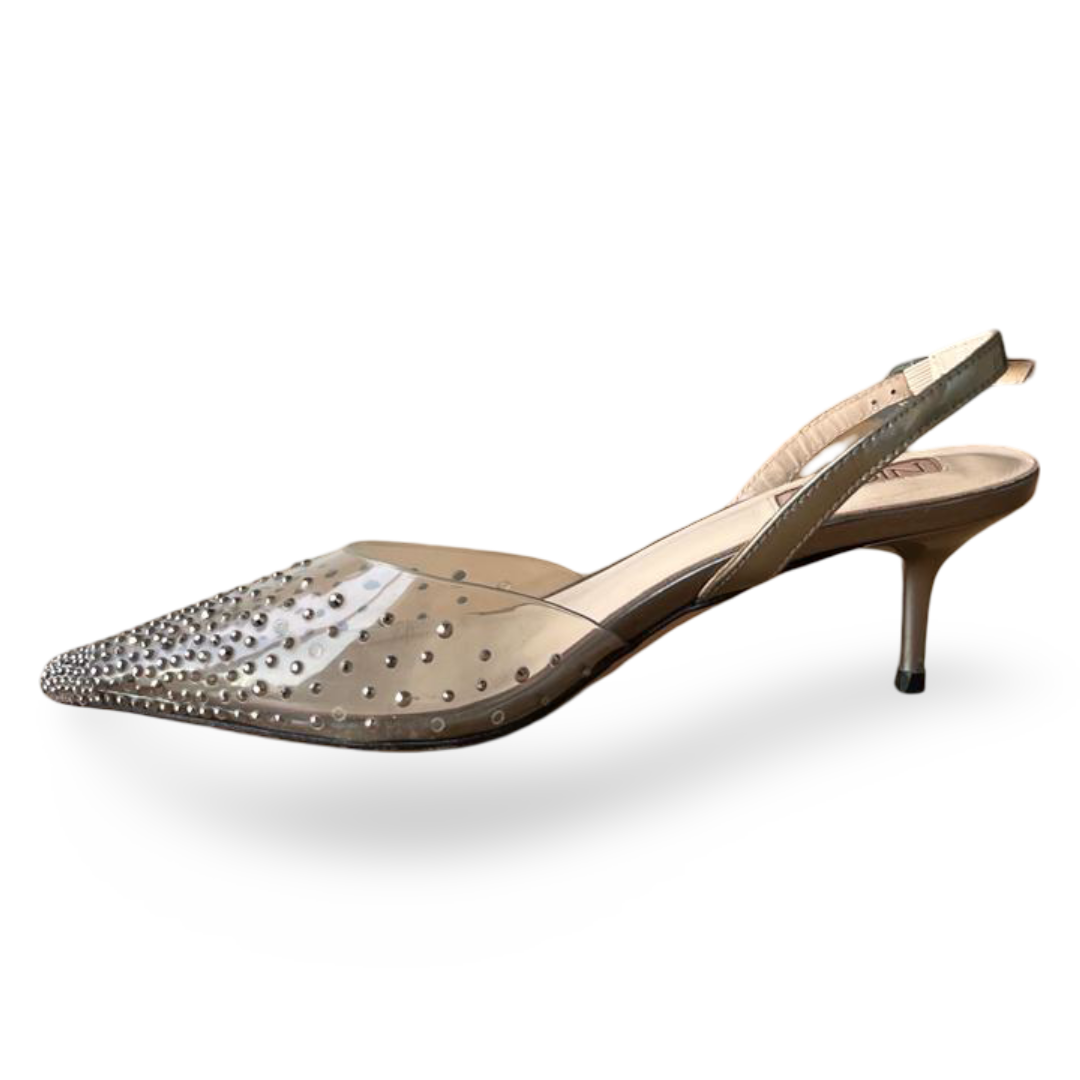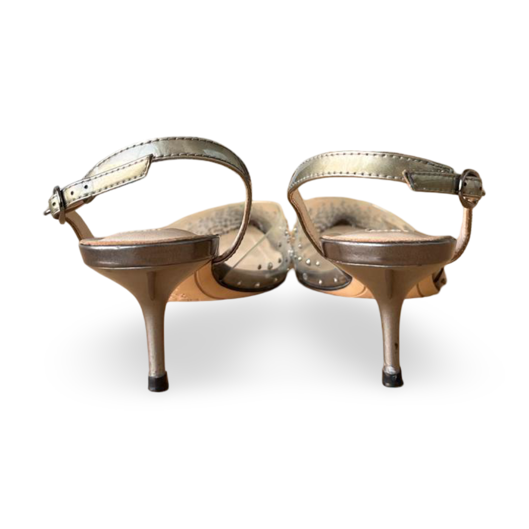 - Condition: Pre-owned, in very good condition. PVC upper is clear and clean, crystals intact, slingback strap functional, with minimal signs of wear on soles and heels.