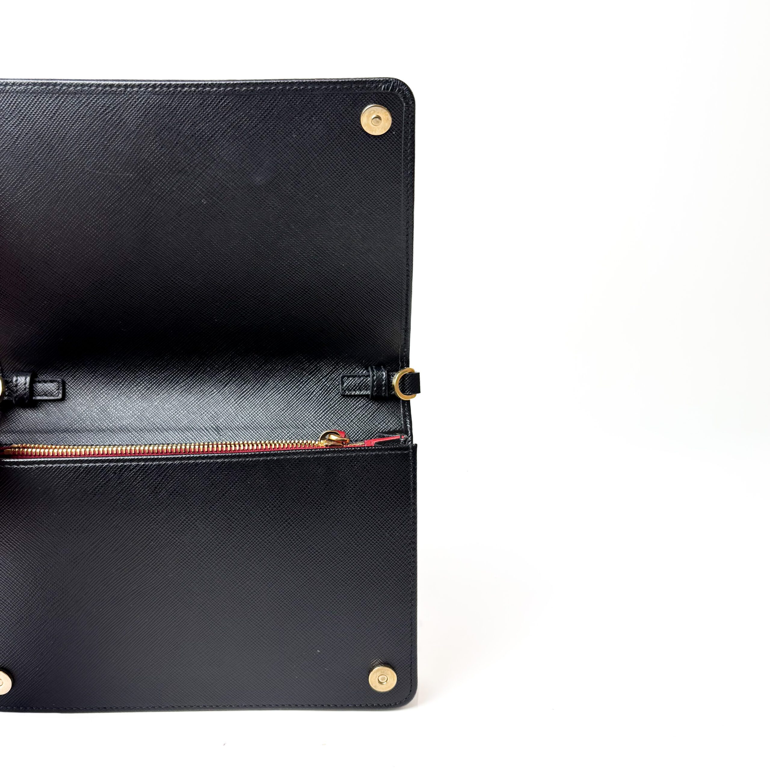 - Condition Summary (Pre-Owned): Excellent pre-owned condition. The Saffiano leather remains rigid with rich, even color and no visible corner wear. The front logo is crisp and unworn. The interior red lining is clean and well-maintained. A faint curved surface mark is visible on the underside of the interior flap. Gold-tone hardware is bright and fully functional, and interior compartments show minimal signs of use.