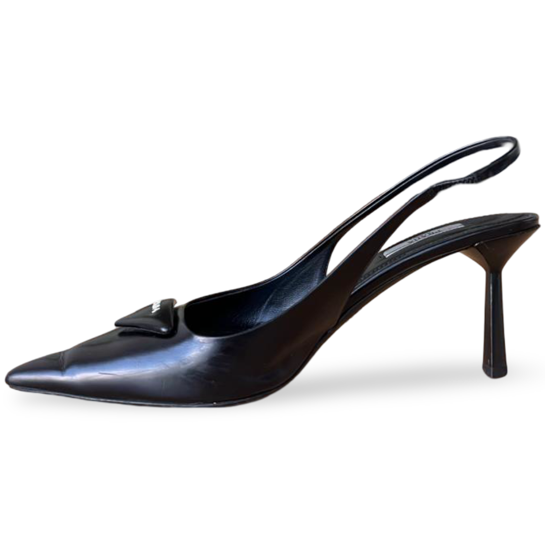 These Prada Calzature Donna pumps are crafted from nero spazzolato leather, offering a sleek, polished finish. Designed with a classic pointed toe and a moderate stiletto heel, they combine timeless elegance with everyday versatility, making them perfect for both professional and evening wear.