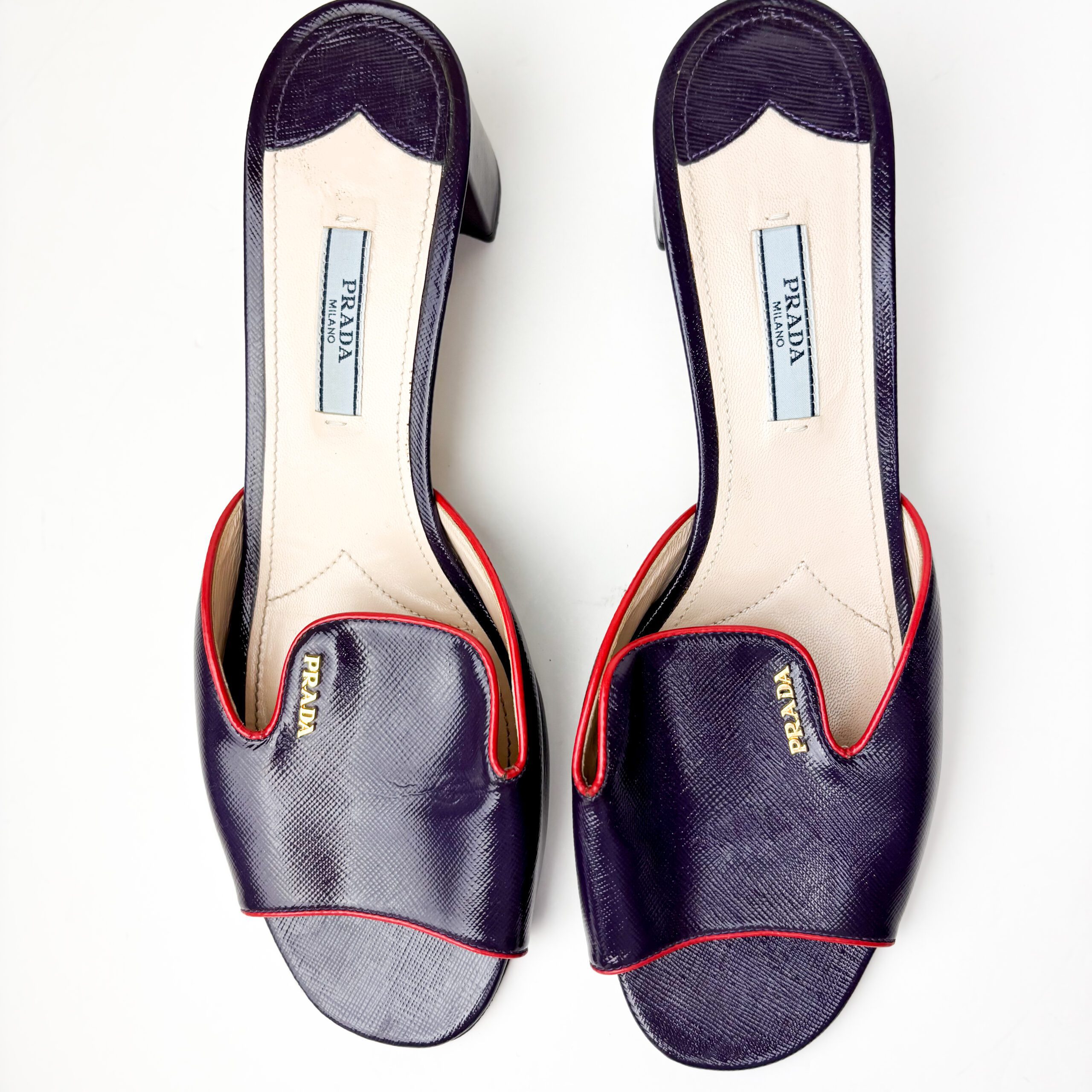 • Condition Summary (Pre-Owned): Good pre-owned condition. The leather outsoles show heavy scuffing and wear consistent with regular use, though the Prada logo stamps and size markings remain clear. The purple Saffiano patent uppers are well-preserved with no major scratches, tears, or cracking. Gold-tone logo hardware is bright and intact, and the contrast piping remains crisp. Insoles show light wear and minimal darkening, with interior branding clean and legible.