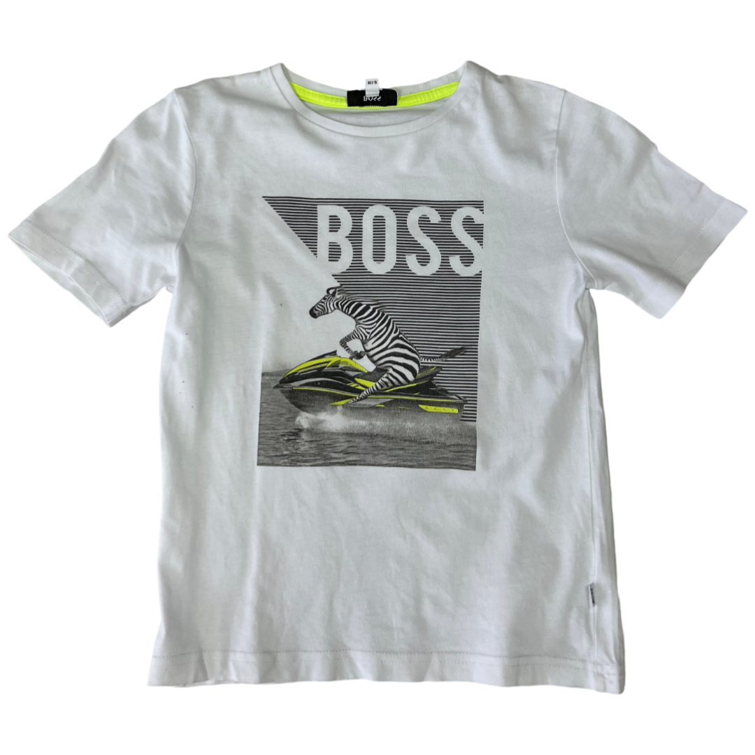 A trendy and comfortable Boss Boys outfit, perfect for casual wear. This set includes a white cotton T-shirt featuring a stylish zebra print and gray shorts for a cool and coordinated look.