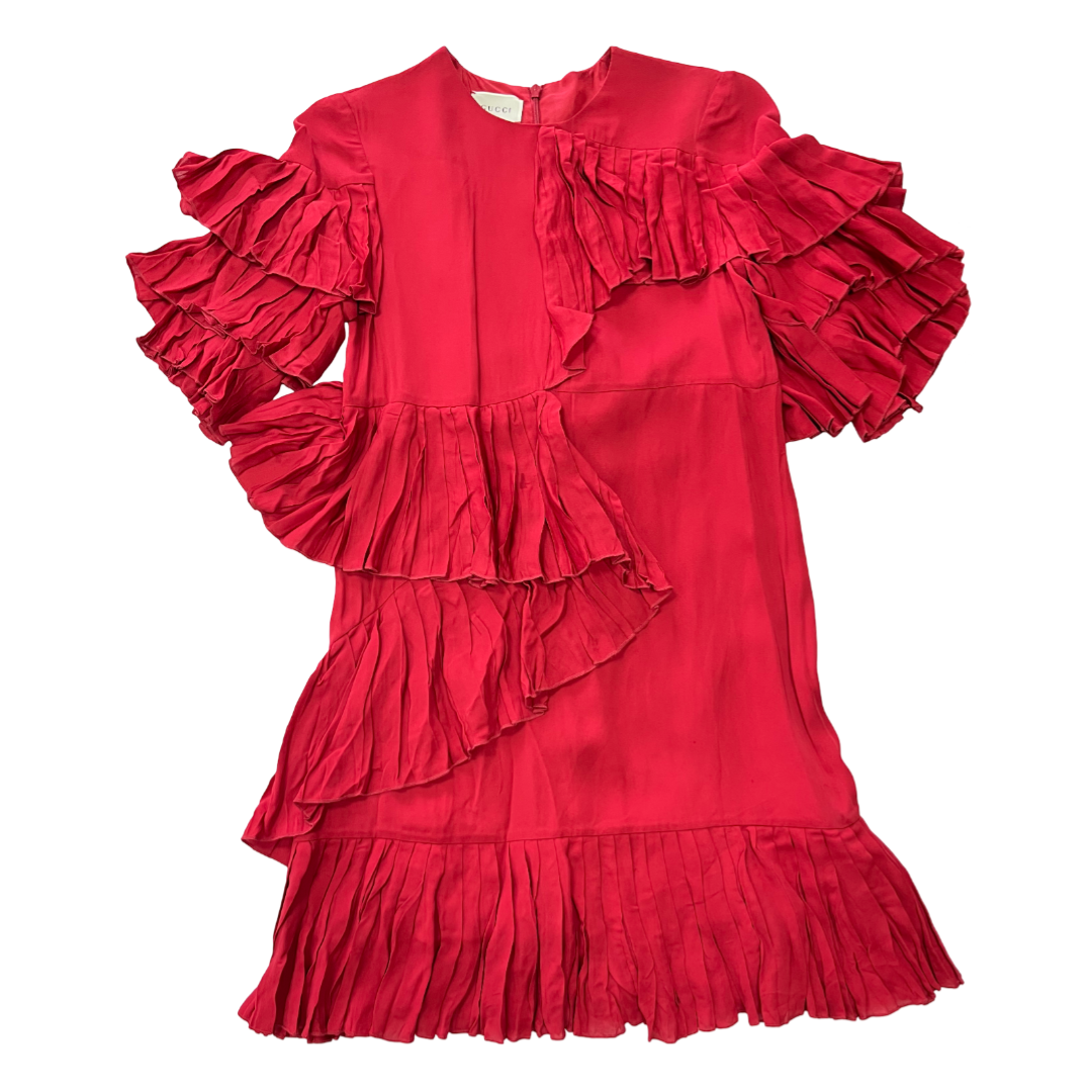 This Gucci Ruffled Silk-Georgette Dress in a stunning Hibiscus Red hue is a timeless and elegant choice for any occasion. The delicate ruffle detailing adds a feminine touch, while the luxurious 100% silk-georgette fabric drapes beautifully for a flattering silhouette.