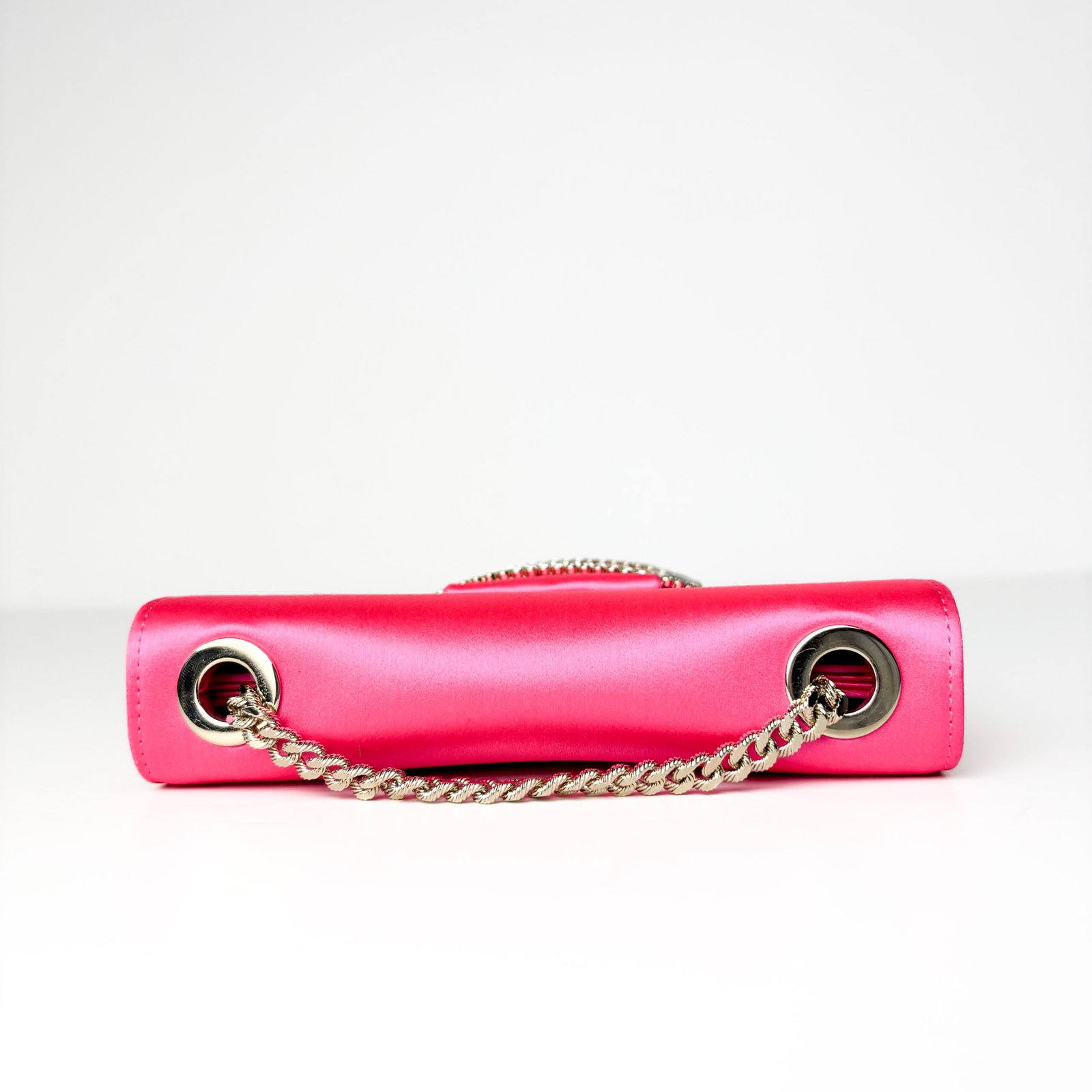- Condition (Pre-Owned): This bag is in very good condition, with clean, crisp satin and an intact, high-shine crystal buckle with no missing stones. The only notable flaw is a small area of dark staining along the edge of one side panel, while the chain strap remains bright and untarnished.