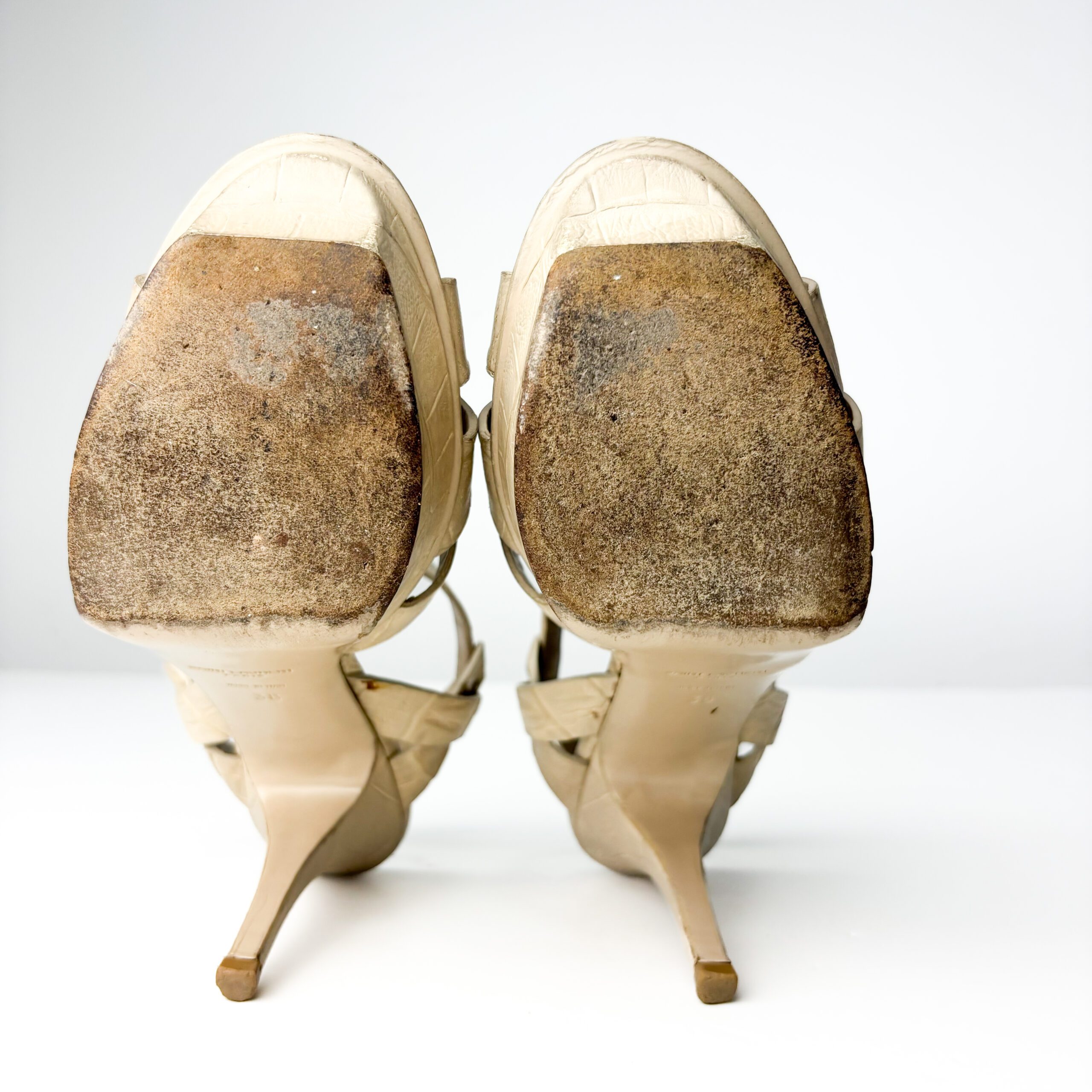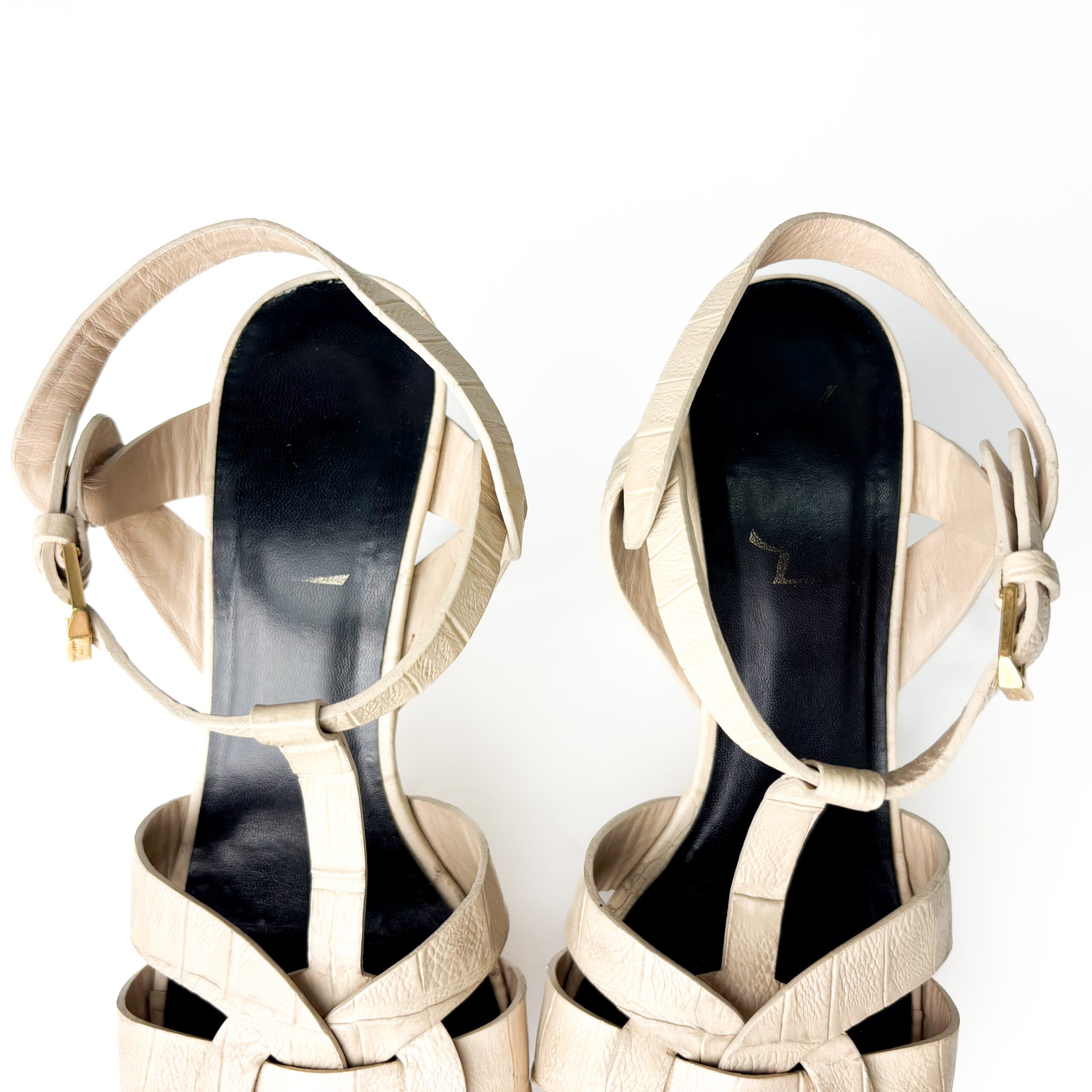Sophisticated Saint Laurent Tribute platform sandals in light-colored crocodile-embossed leather, featuring signature interwoven straps and a high platform heel. The textured finish and elegant silhouette make them perfect for formal or evening wear.