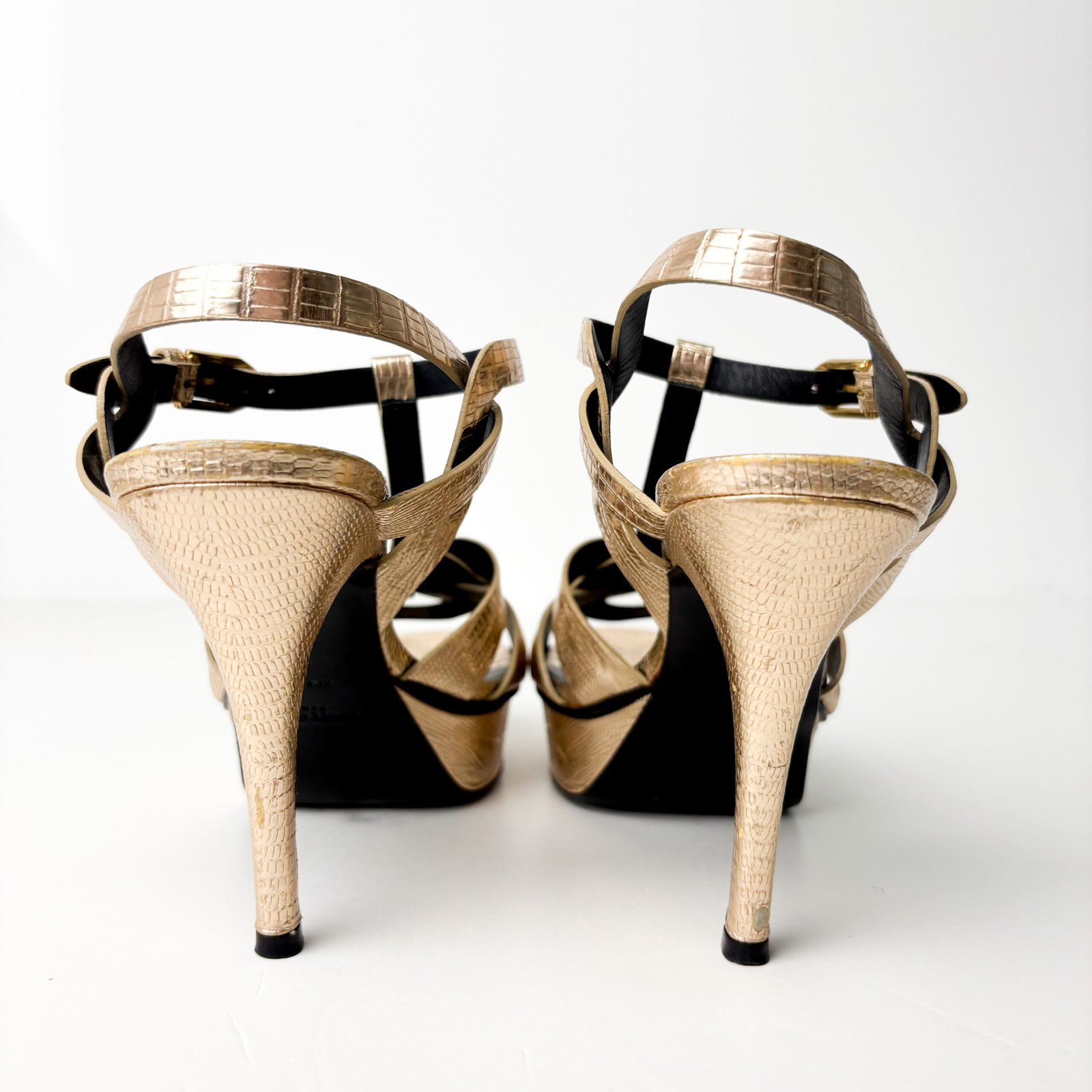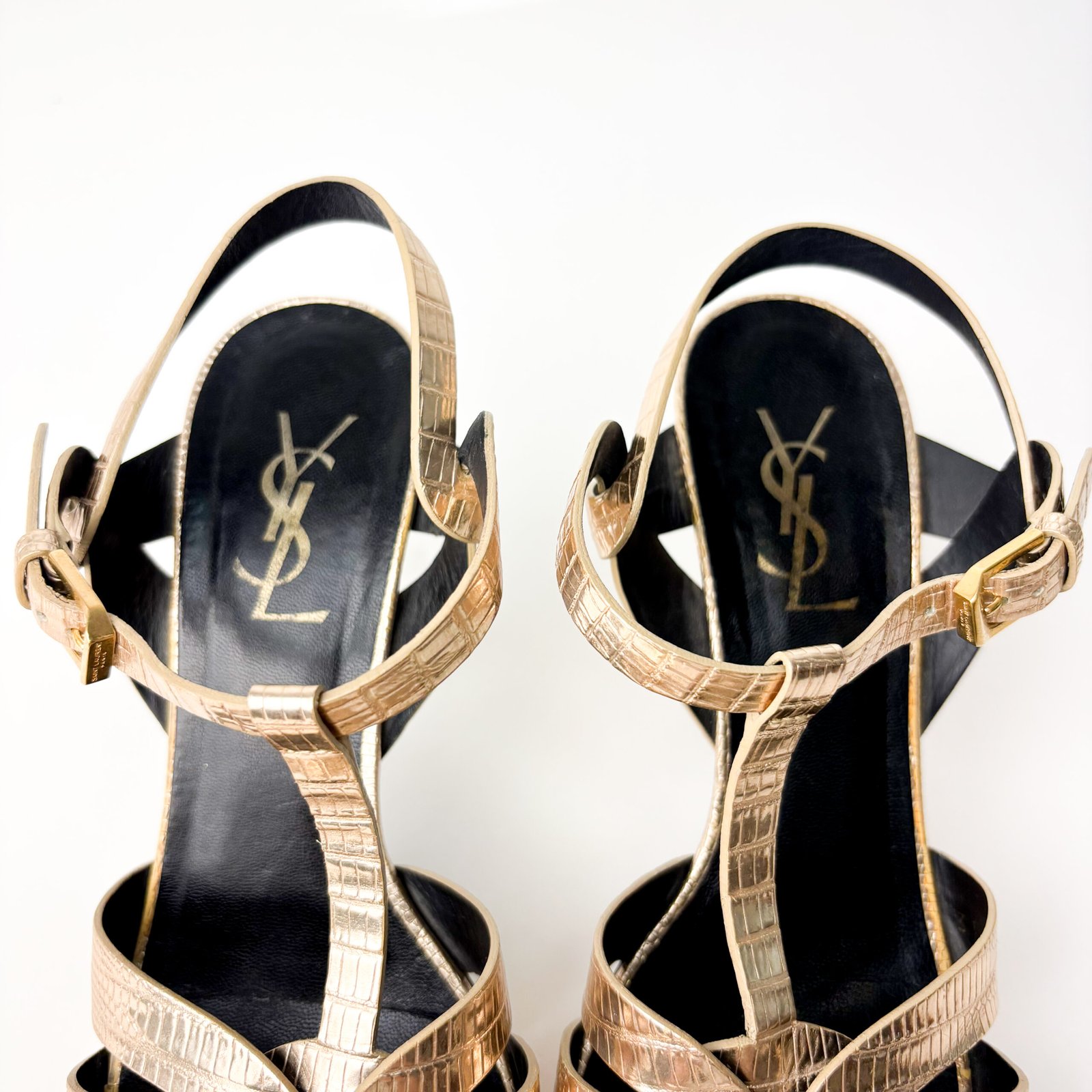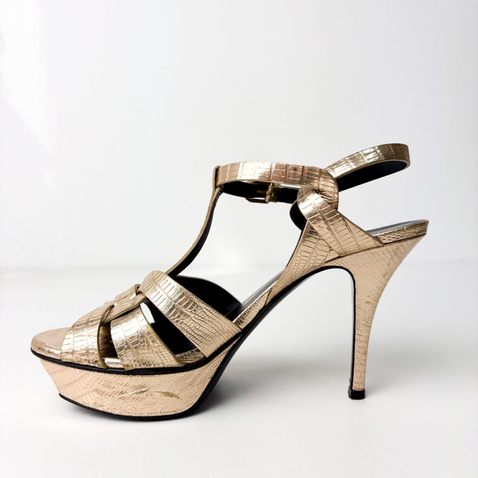 Elegant Saint Laurent Tribute platform sandals crafted in metallic gold lizard-embossed leather with signature interwoven straps and a high stiletto heel. A timeless design perfect for formal occasions or adding luxury shine to any outfit.
