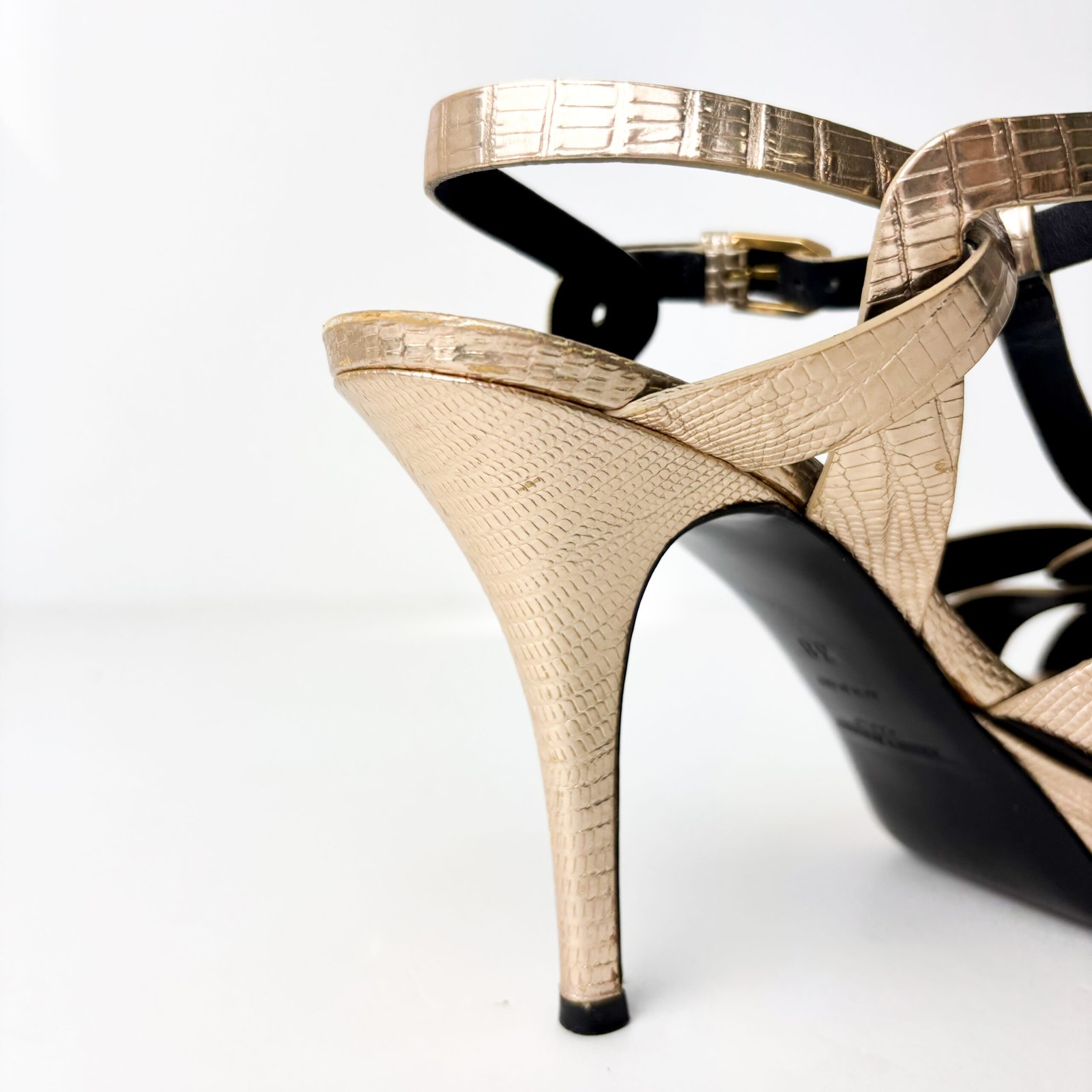 • Condition (Pre-Owned): These sandals are in good pre-owned condition, with visible wear on the leather outsoles, slightly flattened heel tips, and rubbing on the footbed revealing the lighter base beneath. The metallic lizard-embossed leather straps remain structurally sound, the ankle buckles are bright, and the YSL heel pad branding is intact.