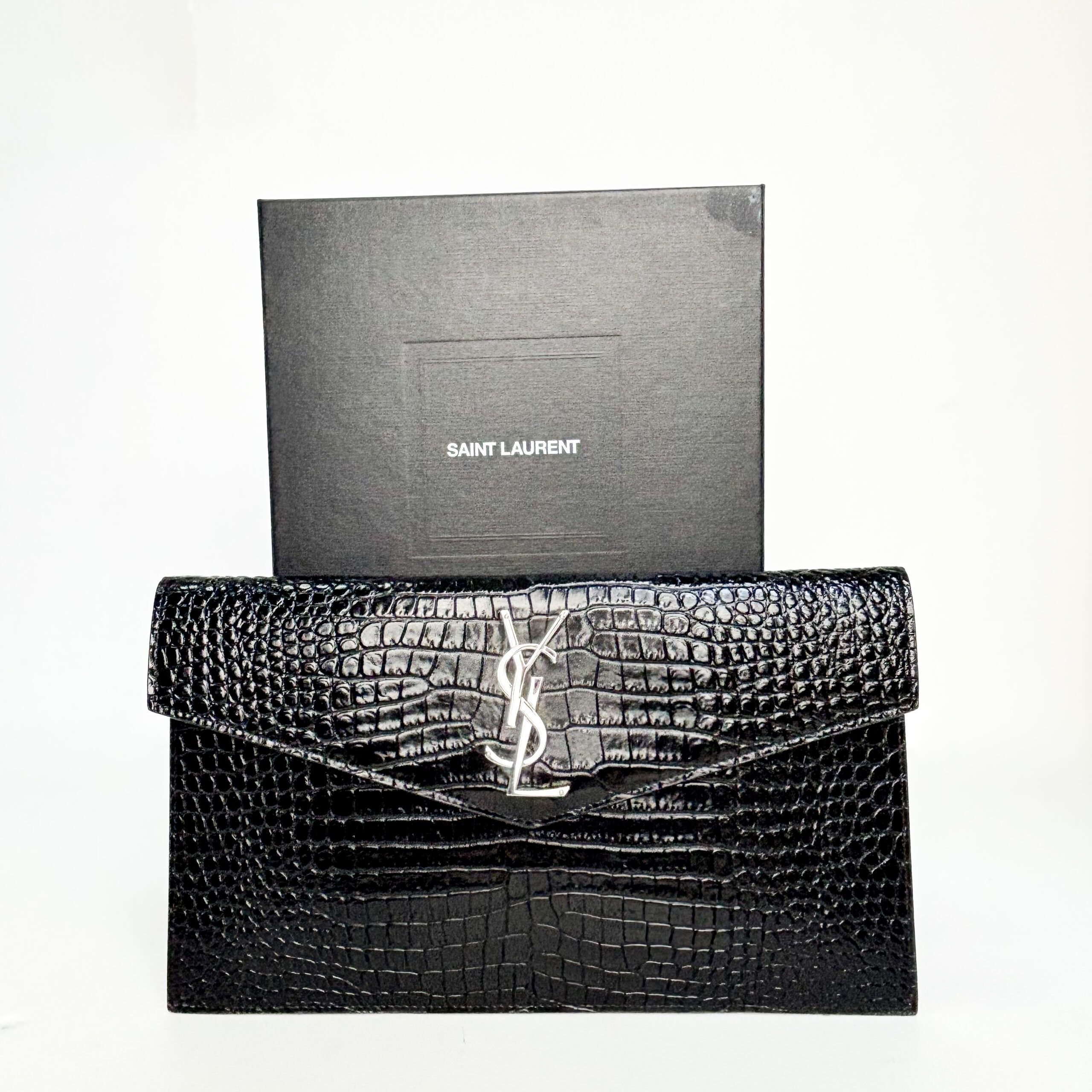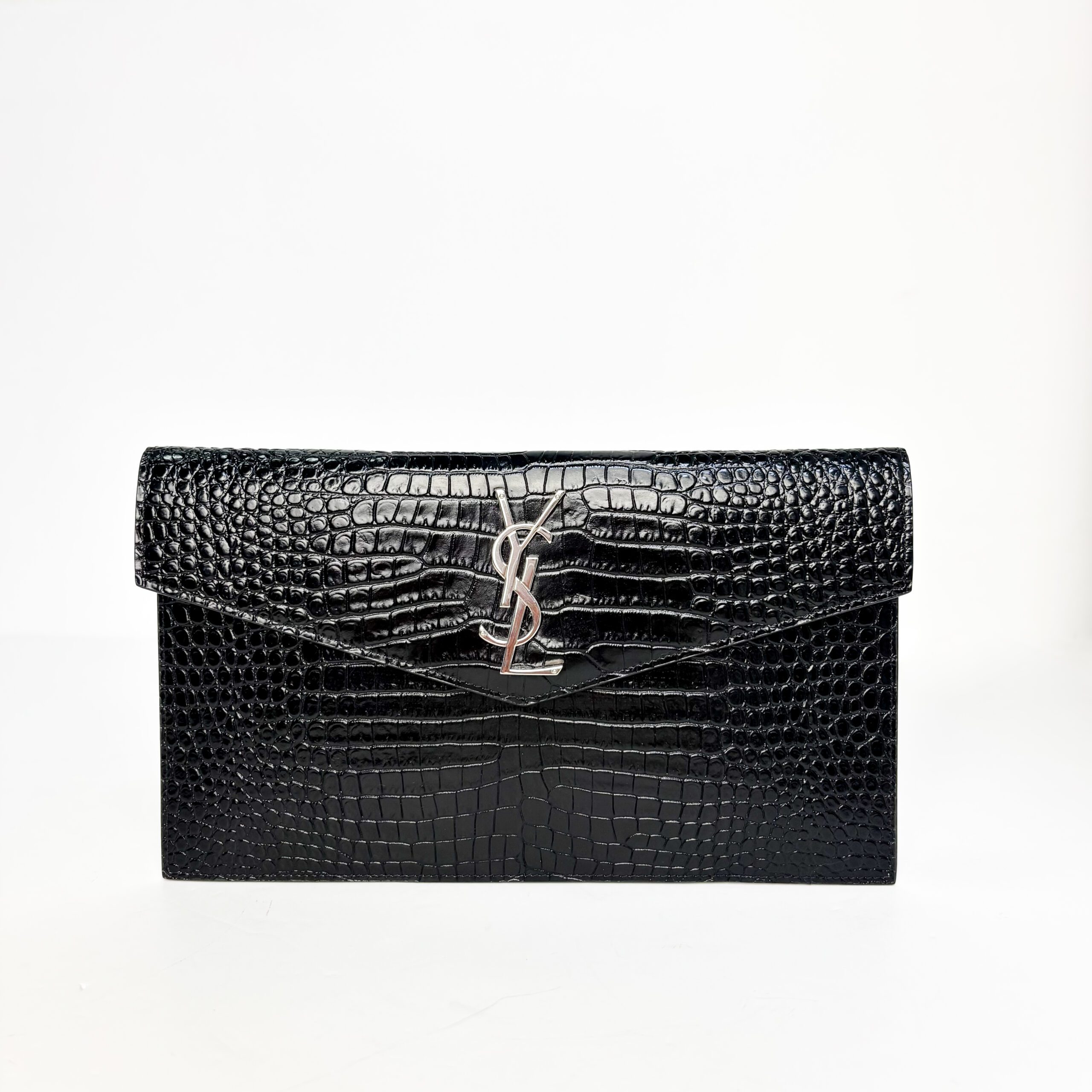 Elegant Saint Laurent Uptown pouch crafted in glossy black croc-embossed leather, finished with the iconic silver-tone YSL monogram plaque at the front. A sleek envelope-style clutch that works effortlessly for evening wear or as a refined day-to-night accessory.