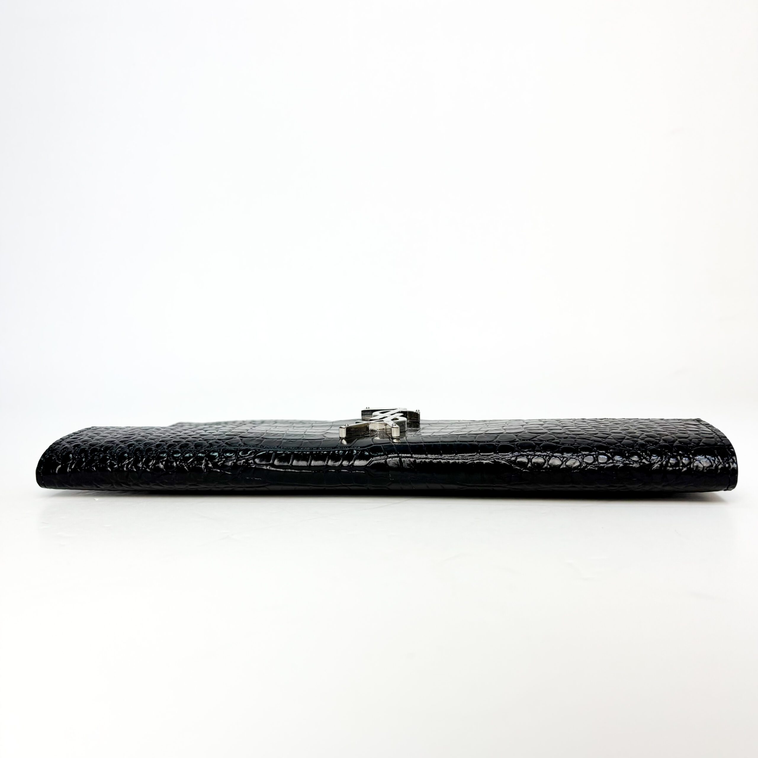 - Condition Summary (Pre-Owned): Very good pre-owned condition. The croc-embossed leather remains glossy and well-structured with only minimal surface wear. The silver-tone YSL hardware is bright with light hairline scratches, and the interior is clean with no notable stains or damage.