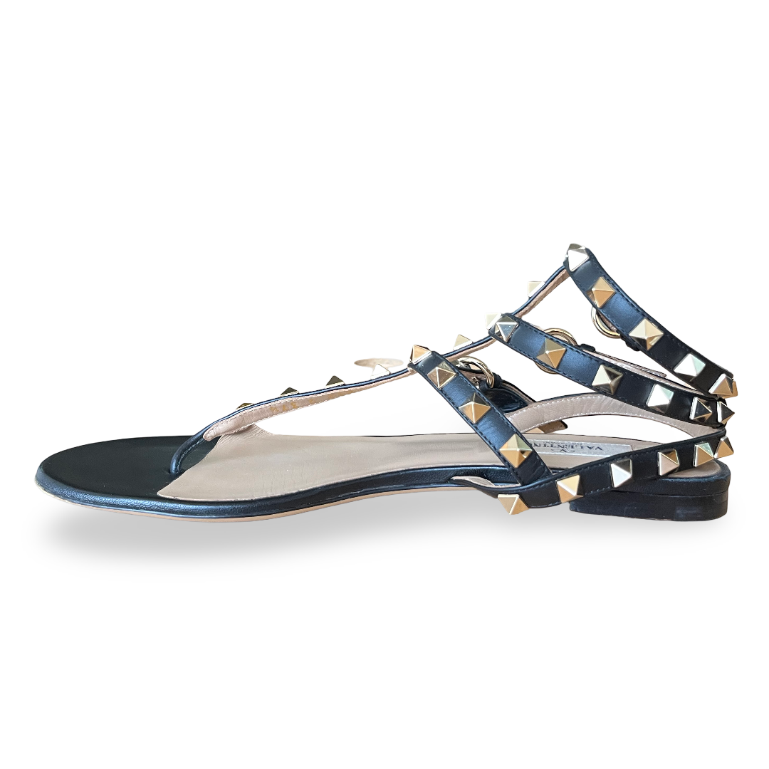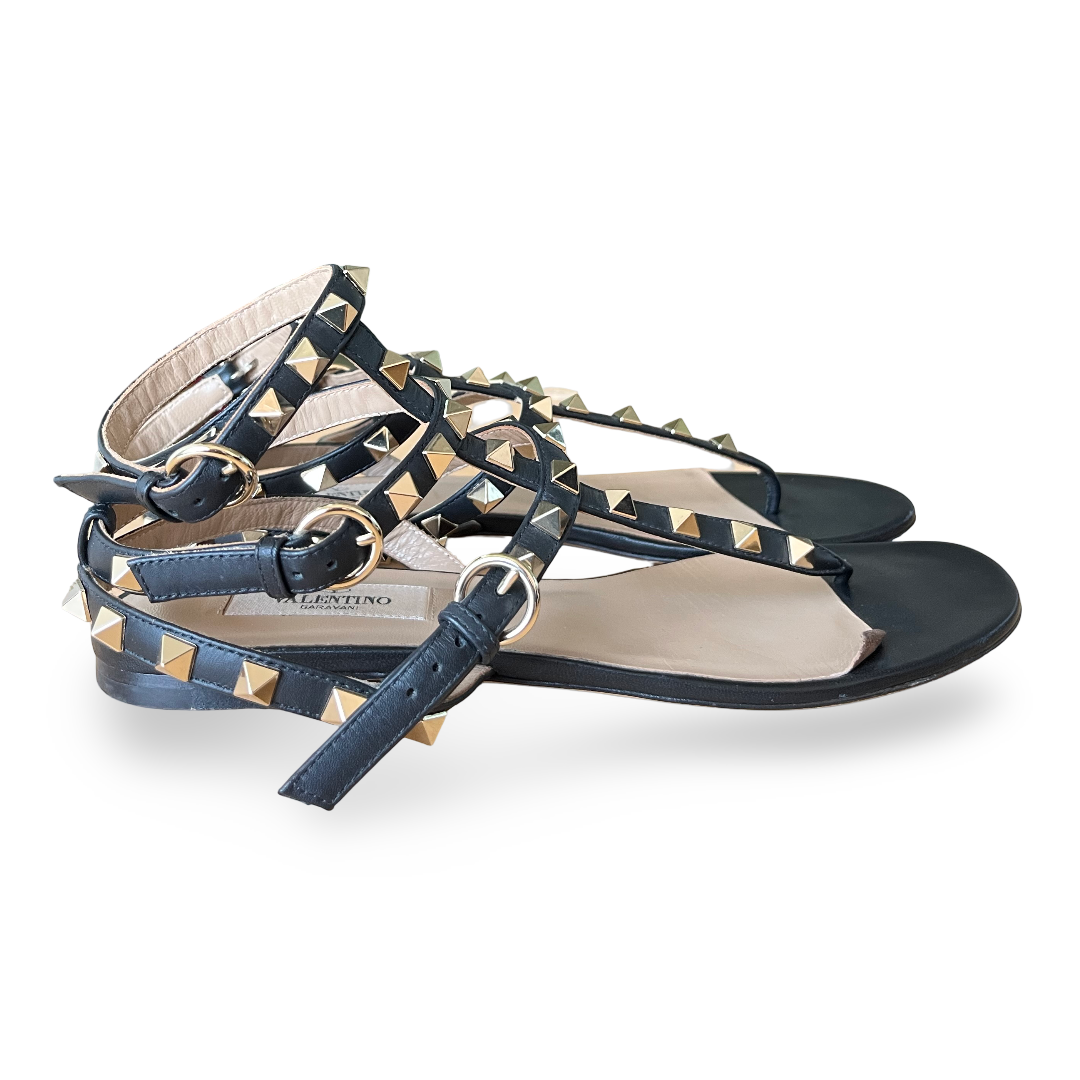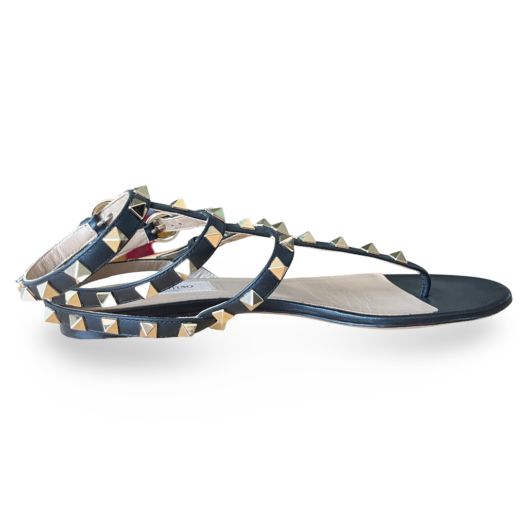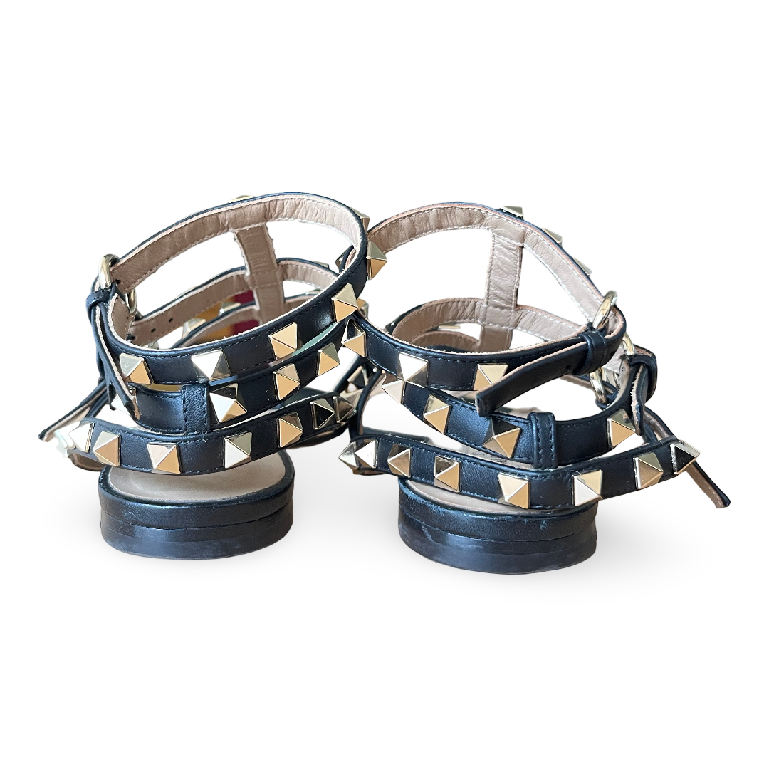 Valentino Black Leather Rockstud Ankle Strap Flat Sandals Size 37.5