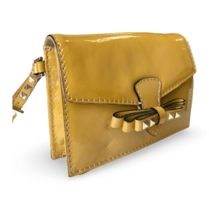 This Valentino Garavani Wristlet Clutch combines playful elegance with edgy sophistication. Crafted from black patent leather, it features a signature bow adorned with iconic gold-tone pyramid studs, creating a bold yet feminine statement. Compact and versatile, it’s perfect for evening events or carrying essentials on the go.