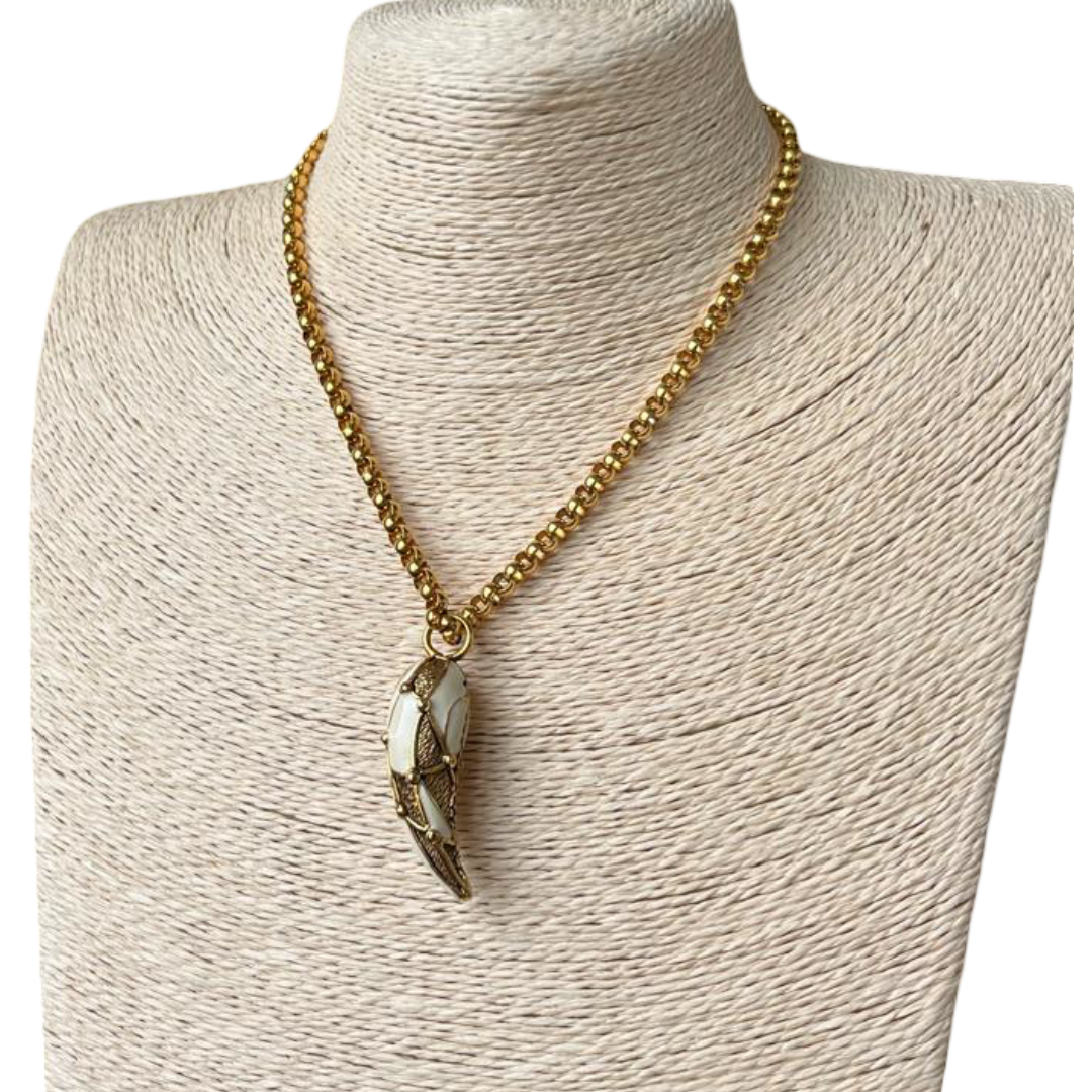 This striking vintage Roberto Cavalli tusk necklace showcases the brand’s bold aesthetic with a smooth white enamel tusk pendant capped by an ornate gold-tone filigree design. Suspended from a classic gold-tone rolo chain, this piece delivers an elegant yet dramatic statement that blends exotic charm with refined craftsmanship.